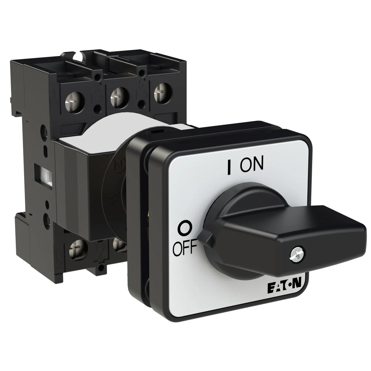 Spínač On/Off In=25A P=13kW. Bez pomocných obvodů. S černým knoflíkem a přední deskou
