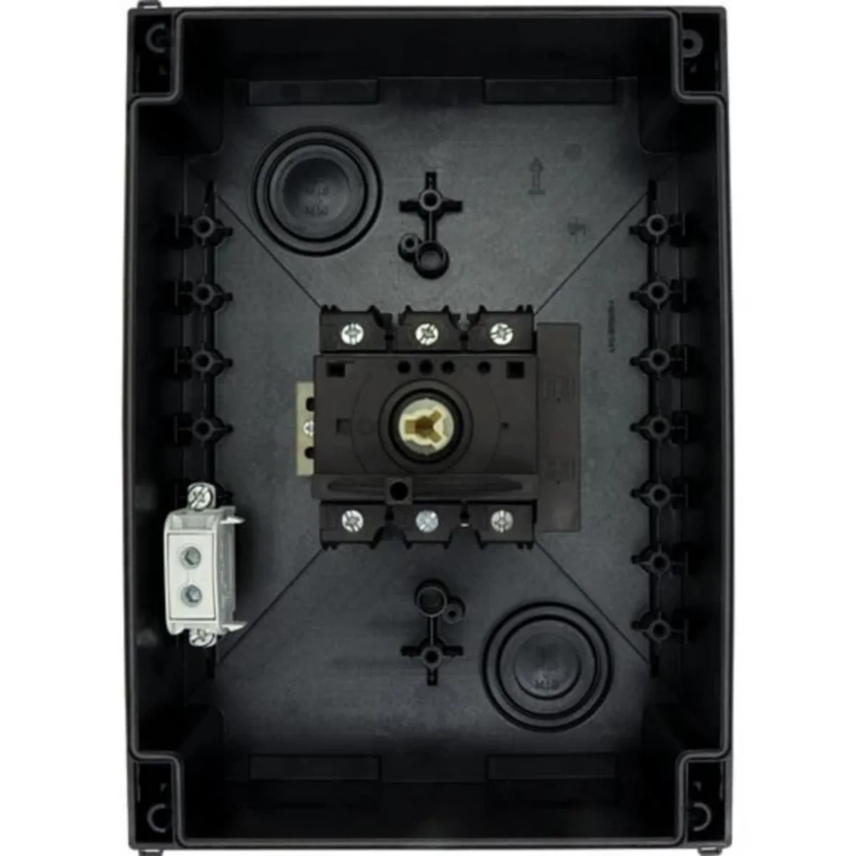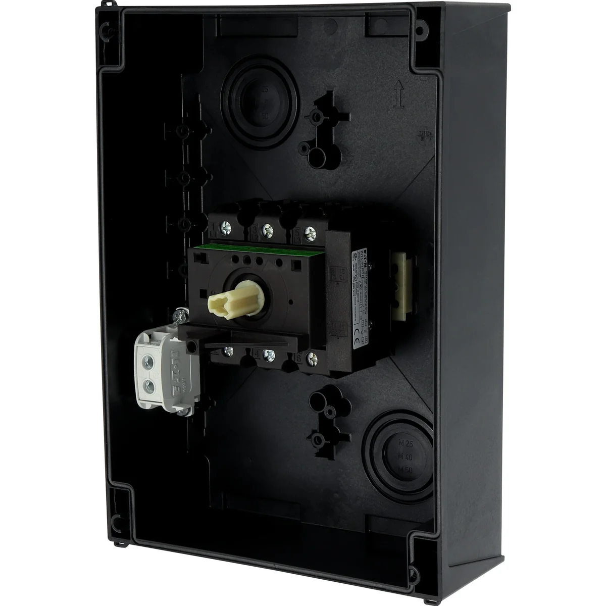 Spínač On/Off In=63A P=37kW. S červenožlutým knoflíkem se zamykáním visacím zámkem podle IEC/EN 60204-1, VDE 0113, část 1. Uzamykatelné v poloze 0