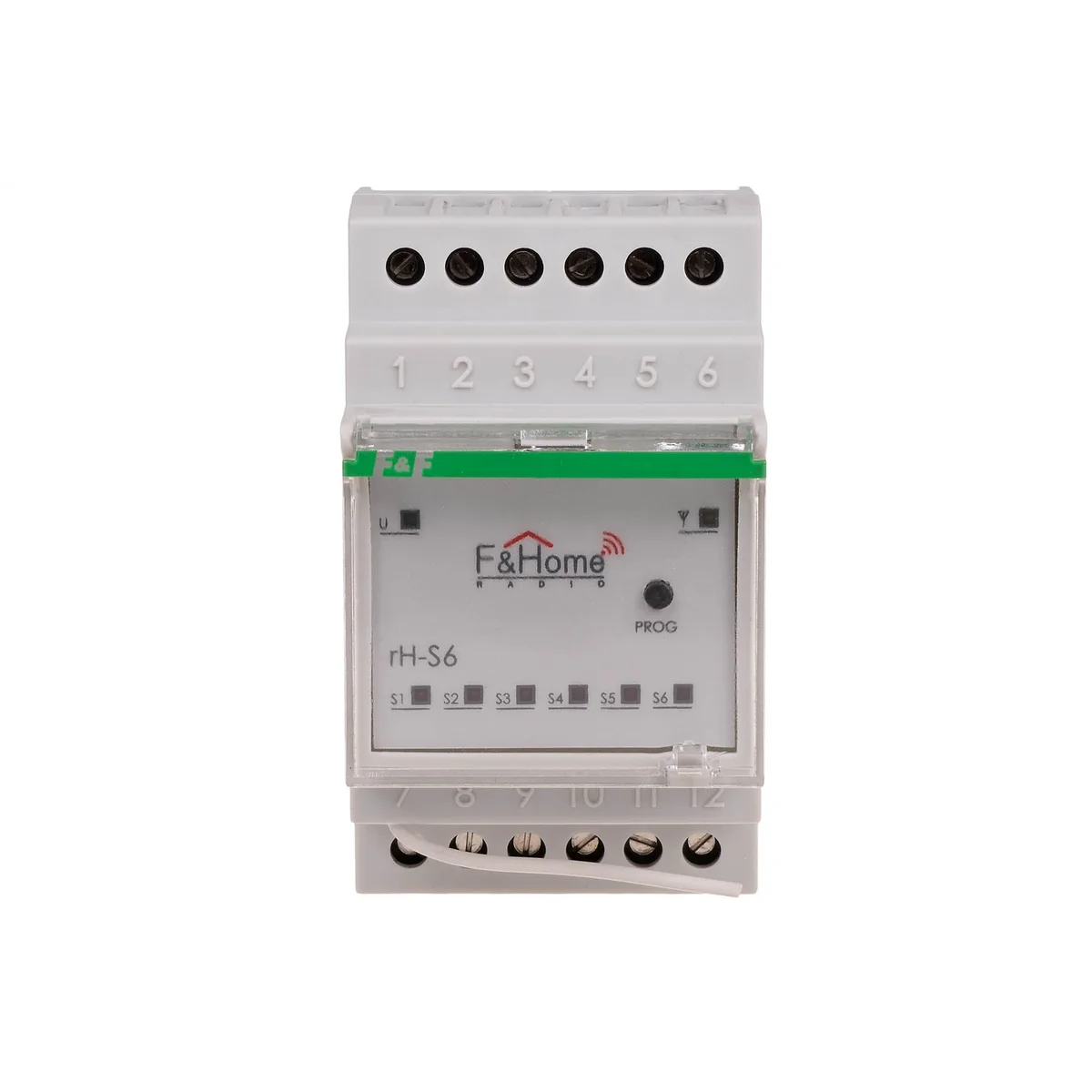 rH-S6 má vstupy pro připojení šesti monostabilních bezpotenciálových kontaktů. Modul zasílá do systému informace o sepnutí nebo otevření kontaktů. Komunikace se serverem probíhá prostřednictvím rádia.