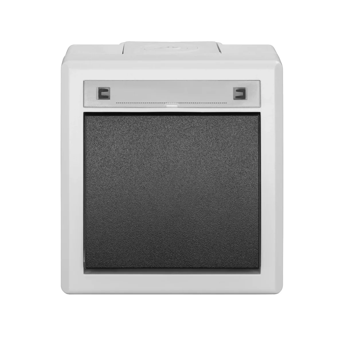 Jednopólový povrchový spínač (dvoucestný) z řady AQUANT 2K, v šedé barvě (RAL 7035/7016), určený pro povrchovou montáž. Produkt se pyšní vysokým krytím IP55, které zajišťuje odolnost proti prachu a vodě a umožňuje použití v náročných venkovních podmínkách. Konstrukce 2K zaručuje vzduchotěsnost a odolnost zařízení. Spínač je kompatibilní s rámovým systémem, což umožňuje flexibilní přizpůsobení individuálním potřebám uživatele. Použití vysoce kvalitních materiálů zajišťuje spolehlivost a dlouhou životnost v různých provozních podmínkách.