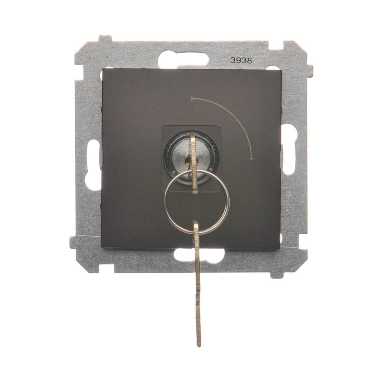 Jednopólový spínač (bistabilní) z řady Simon 54. Klíčový, 2-polohový 0-I Možnost vyjmutí klíče v každé položce, 2 kusy klíče součástí produktu.