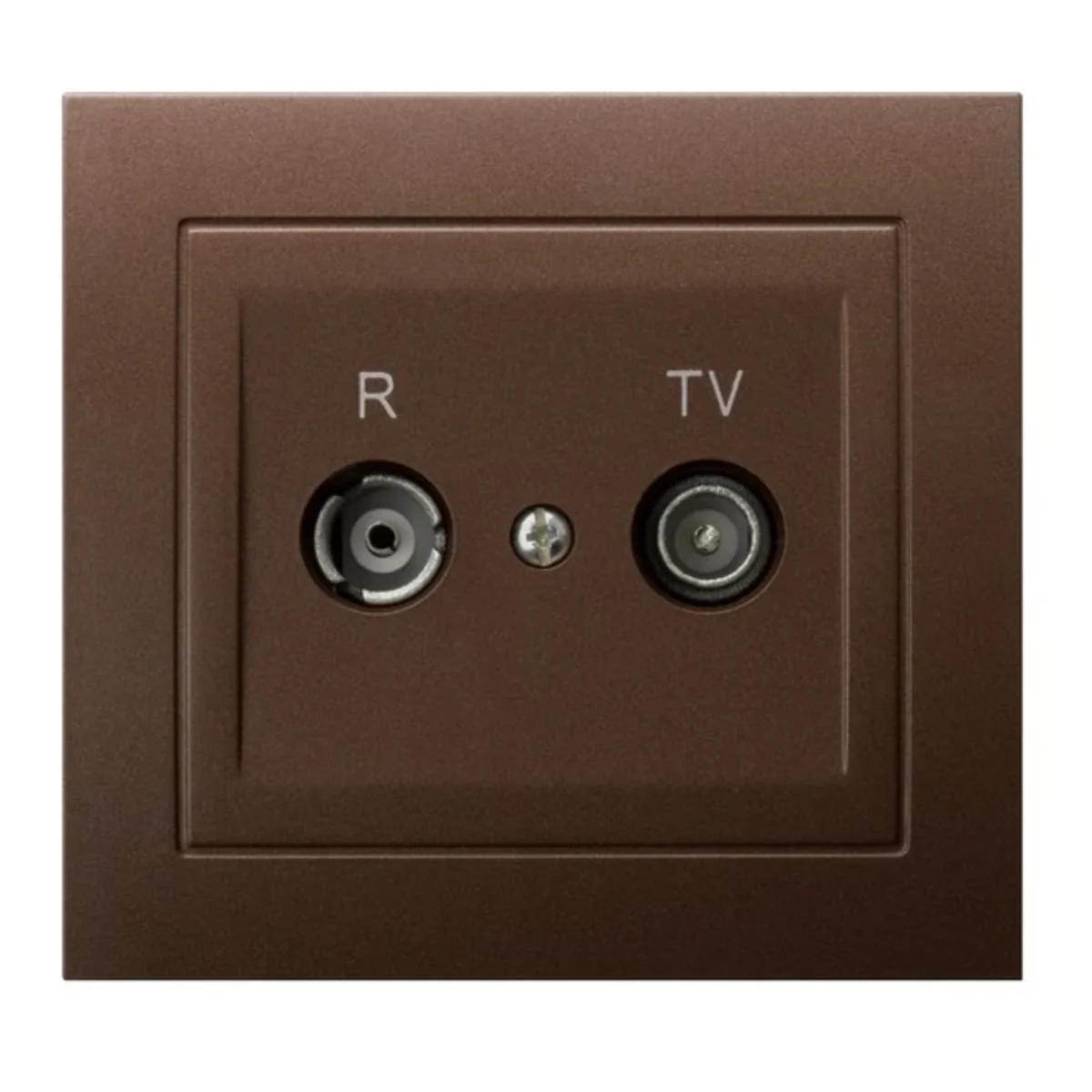 Zásuvka antény RTV průchozí. Je určen pro sériovou instalaci, kdy jeden kabel prochází různými přijímači. Vybavena rámem.