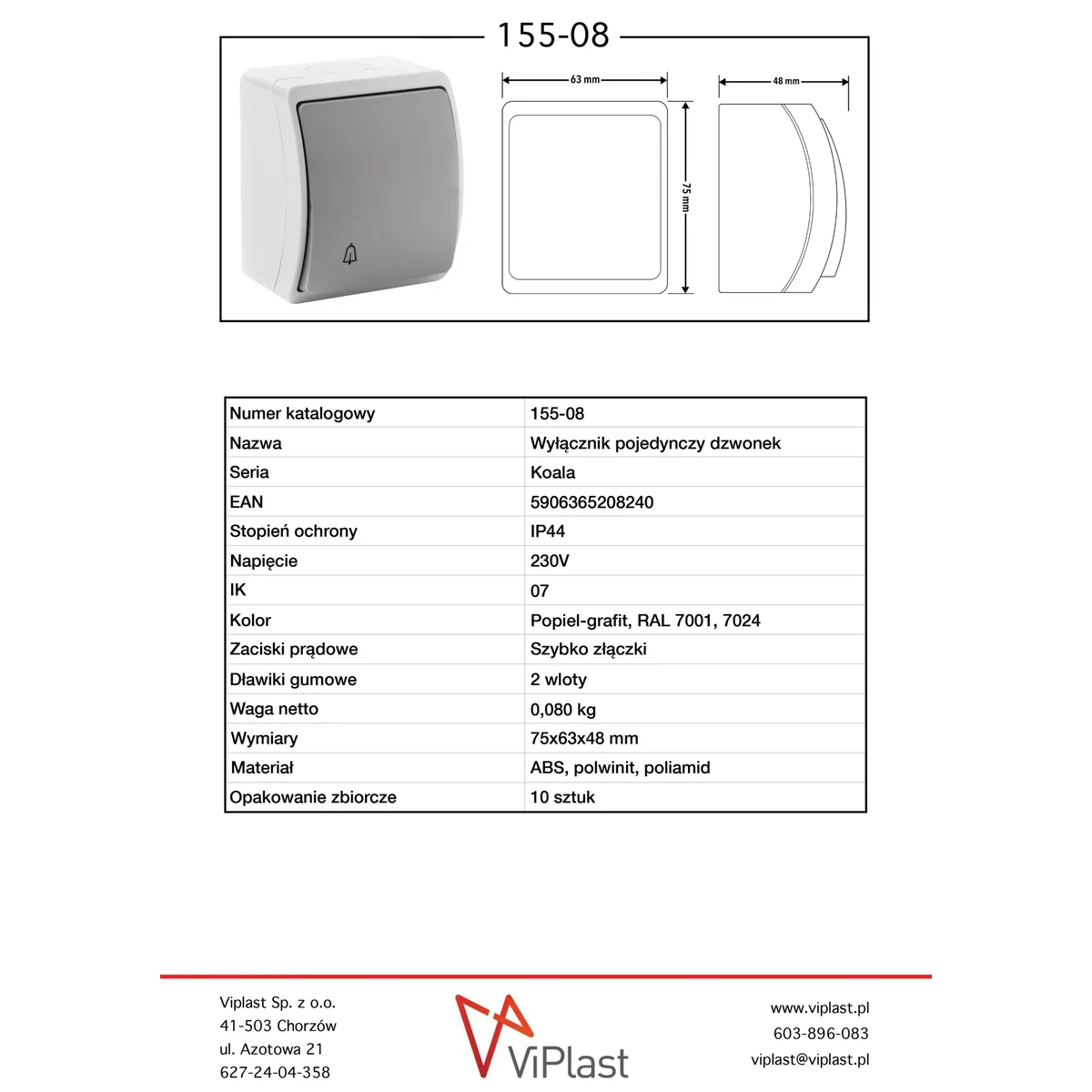 Zvonkový spínač na povrch ze série Koala od výrobce ViPlast. Katalogové číslo produktu je 155-08.