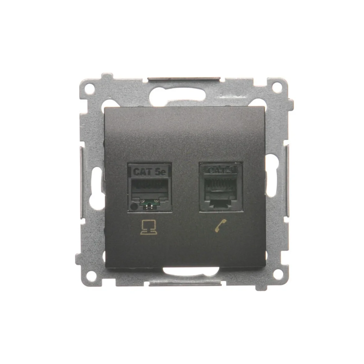 Počítačová zásuvkaRJ45 kategorie 5e + telefonní RJ12, z řady SIMON 54. Vyrobeno z plastu. Se svorkou, která prorazí izolaci.