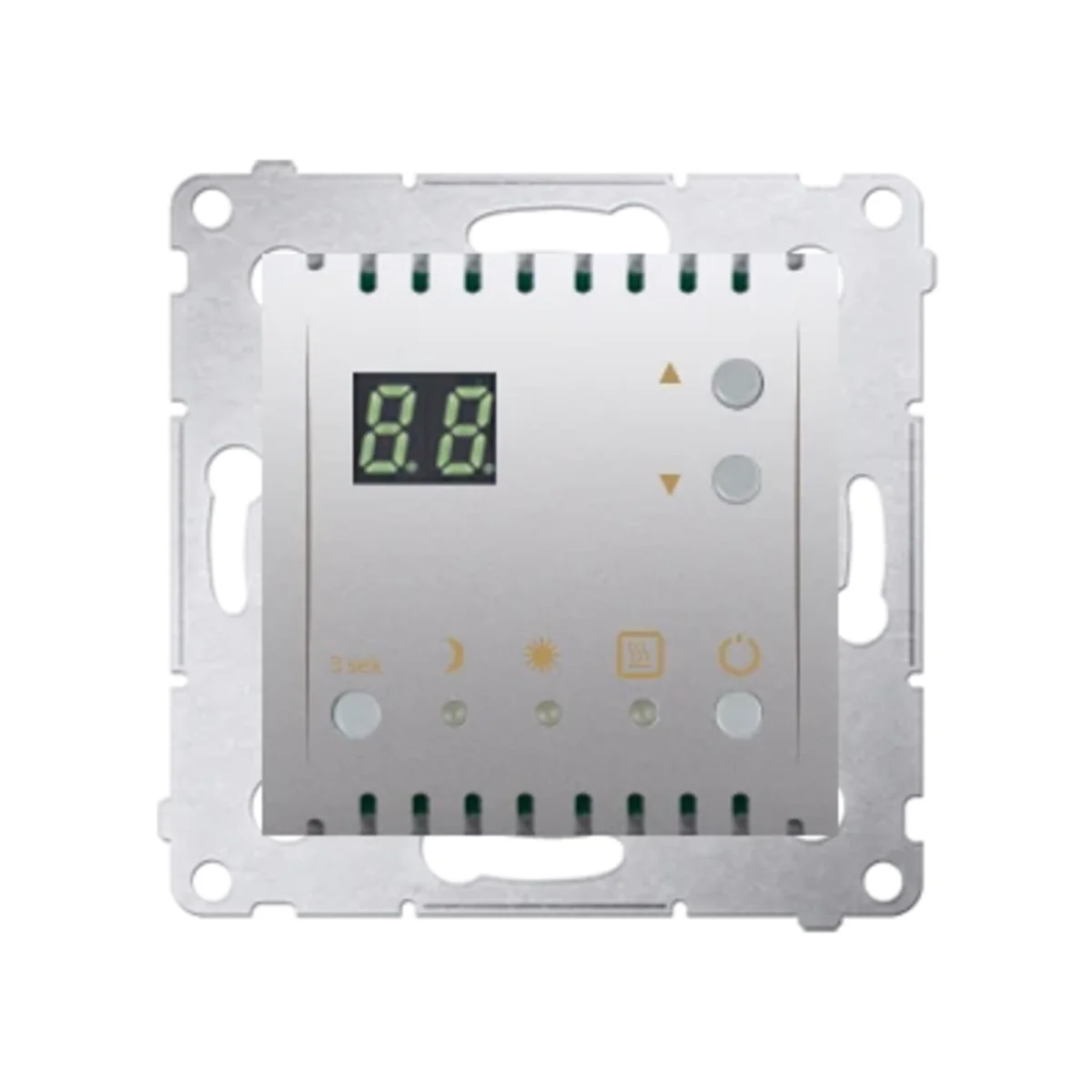 Regulátor teploty s displejem a vnitřním teplotním čidlem ze série SIMON 54 v matné stříbrné, metalické barvě. Je vyrobena z plastu. Jmenovité napětí je 230V. Upevnění pomocí svorek nebo šroubů. Se šroubovacími svorkami.