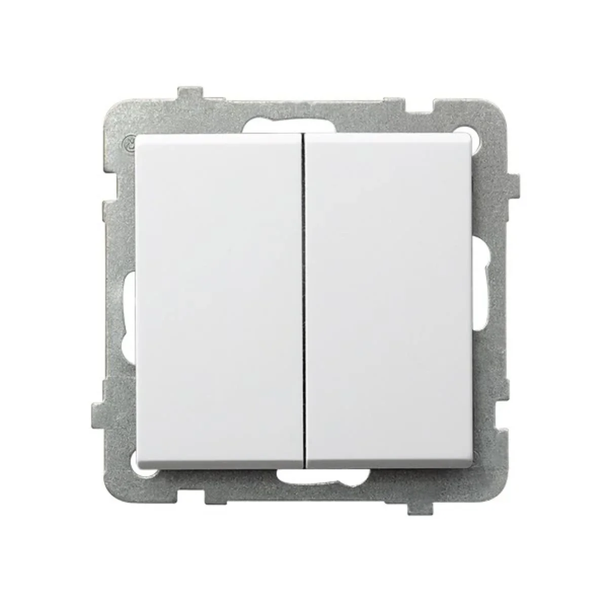 Dvojitý normálně otevřený vypínačz řadySonata od výrobceOspel Katalogové číslo produktu jeŁP-. 17 R/m/00. V bílé barvě.