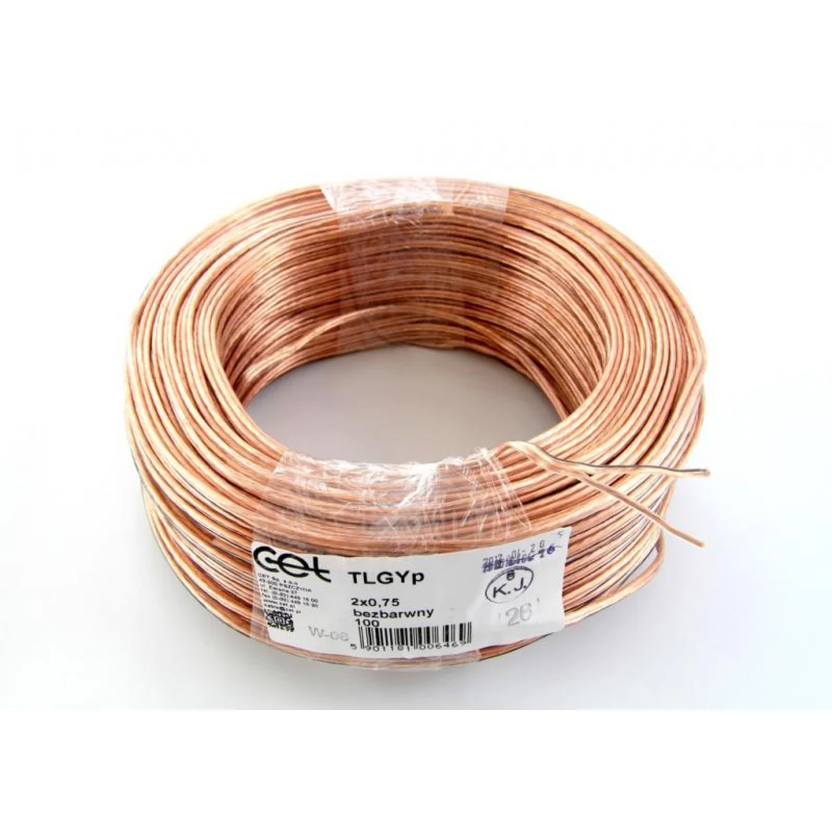 TLgYp 2x0, 75mm2 reproduktorový kabel, měkký, s vodiči stočenými z měkkých měděných drátů, s průhlednou PVC izolací s páskem, plochý.Použití: pro připojení mezi výkonovými zesilovači a reproduktory.