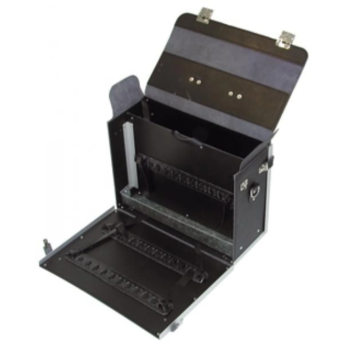 Kufr na nářadí Comet z černé hovězí kůže, všechny okraje vyztuženy hliníkem, dno z pozinkovaného plechu, boční zapínání na nýt, přizpůsobeno pro uchycení ramenního pásu, s rozepínáním vpředu i vzadu, na 2 zipy, s odnímatelnou střední stěnou, všechny stěny s mnoha přihrádkami a poutka na nářadí, bez ramenního popruhu