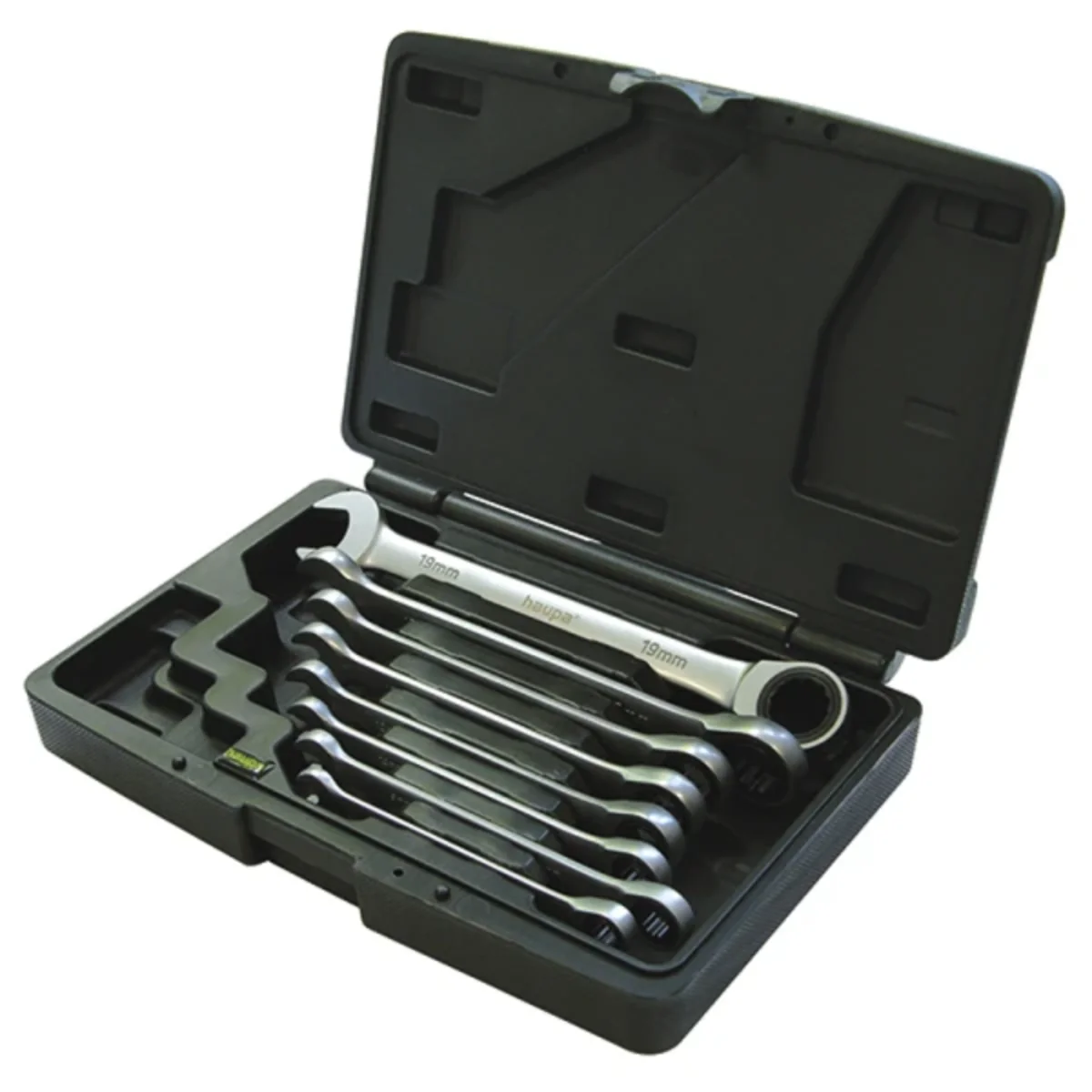 Sada plochých klíčů – očka s ráčnou. Kombinované klíče s ráčnovou funkcí z chrom-vanadiové oceli, chromovaný vnější povrch, leštěný, jemné zuby, 72 zubů, úhel otáčení 5°, strana očka 13° ohnuté, DIN 3113, ISO 3318, v plastové krabičce.Velikosti klíčů