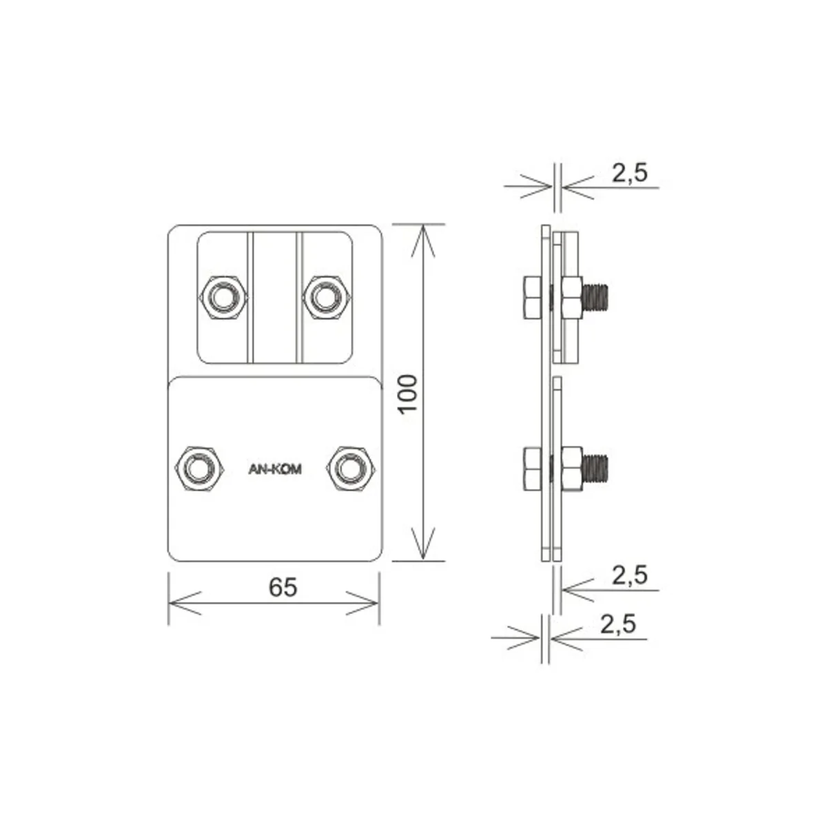 Ovládací konektor (6xM8), žárově zinkovaný. Ovládací konektor pro připojení plochého vodiče - zem s kruhovým vodičem - vybíjecí svorka. třída proudového odporu H=100 kA.