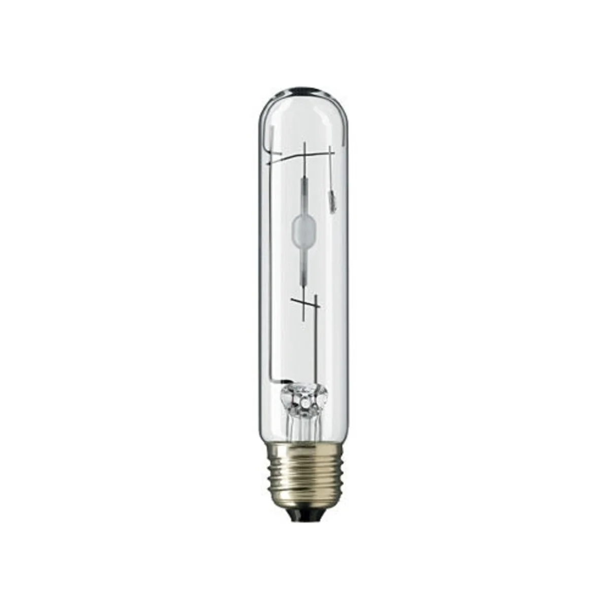 Keramická metalhalogenidová lampa s čirou trubicovou vnější žárovkou pro venkovní použití, vyzařující příjemné bílé světlo.