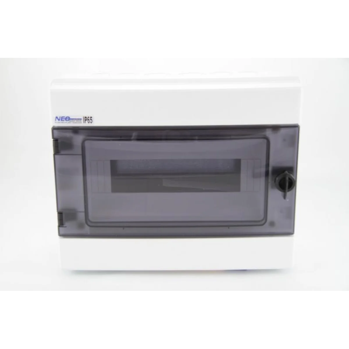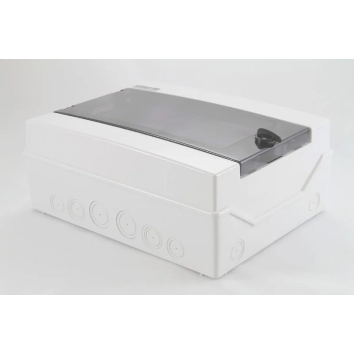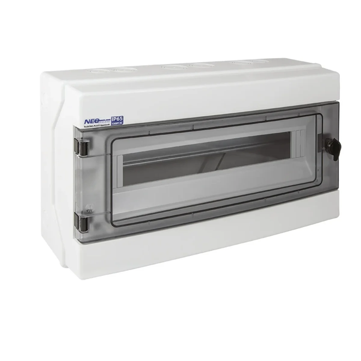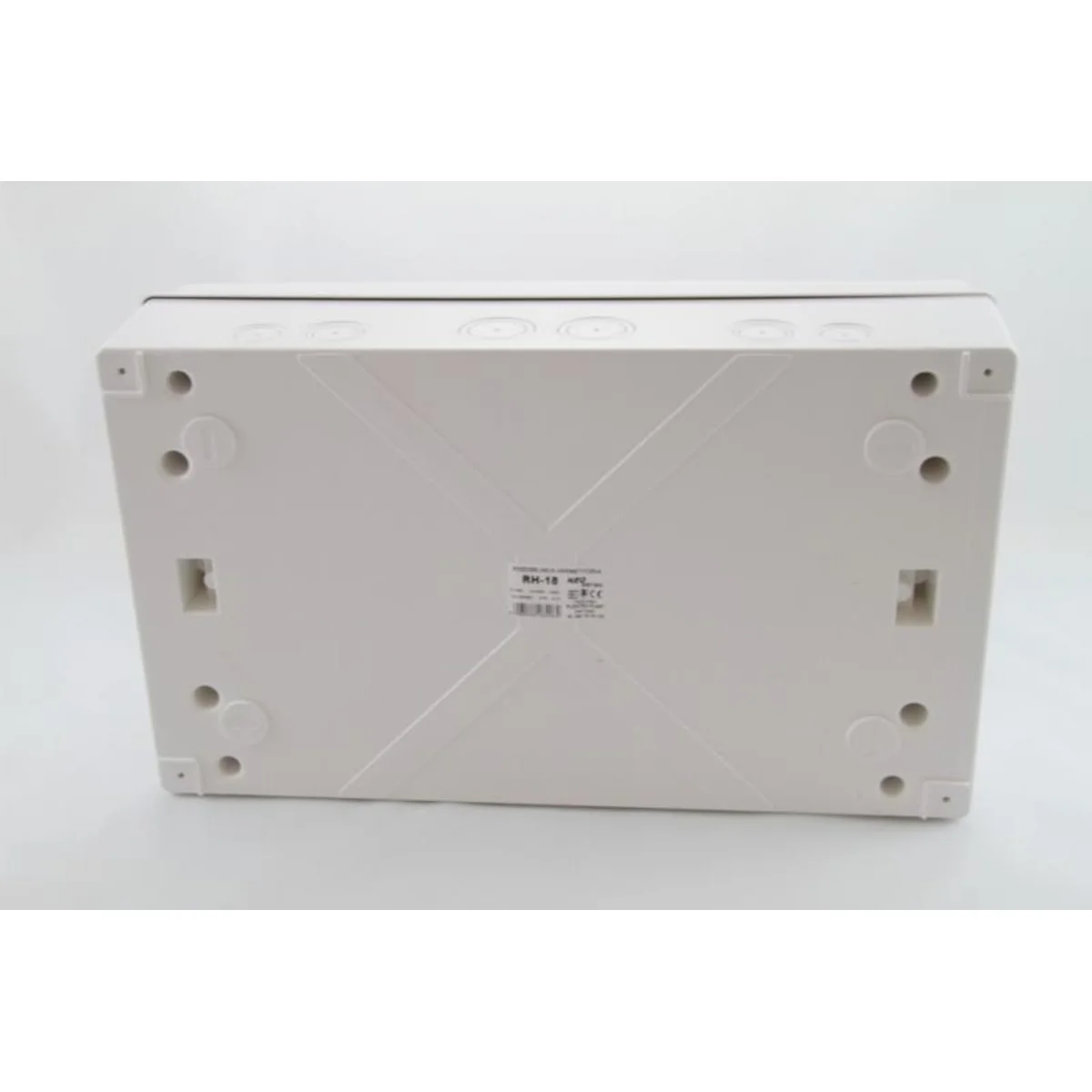 Hermeticky uzavřený rozváděč. RH-18. Hermetické rozváděče řady RH "NEO" jsou určeny pro domácí i průmyslové použití s možností instalace nadproudových vypínačů a elektrických zařízení. Jsou k dispozici ve verzi pro povrchovou montáž a jsou široce používány ve venkovních instalacích. Technické vlastnosti: rozvaděče vybavené průhlednými, tónovanými dvířky otevíranými do strany (vlevo nebo vpravo), přizpůsobené pro montáž zámku na klíč, dostupné v bílé barvě, vyrobené z vysoce kvalitního materiálu >ABS<, odolné vysokým teplotám do 960oC (test se žhavicí tyčí - platí pro svorkovnici, provozní stabilita od -25oC do +60oC, nárazuvzdornost (stupeň IK 07), možnost instalace přístrojů o hloubce 68 a 75 mm, modely 12-modulové a větší vybavené zeslabením ve stěnách pro kabelové vstupy a instalační trubky, možnost utěsnění dveří, rozvaděče vybavené: svorkovnicemi pro N a PE kolejnice, montážní držák TH 35, samolepící štítek pro popis.