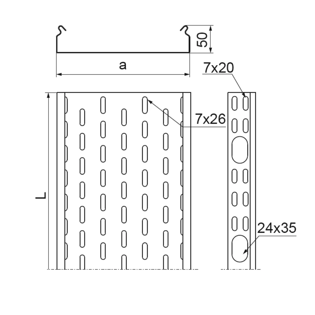 Děrovaný ocelový kabelový žlab pro vedení kabelových tras. Kanály s výřezy na boku žlabu lze spojovat zasunutím do sebe, bez použití spojek. Žlaby bez výřezů lze připojit pouze pomocí konektorů.