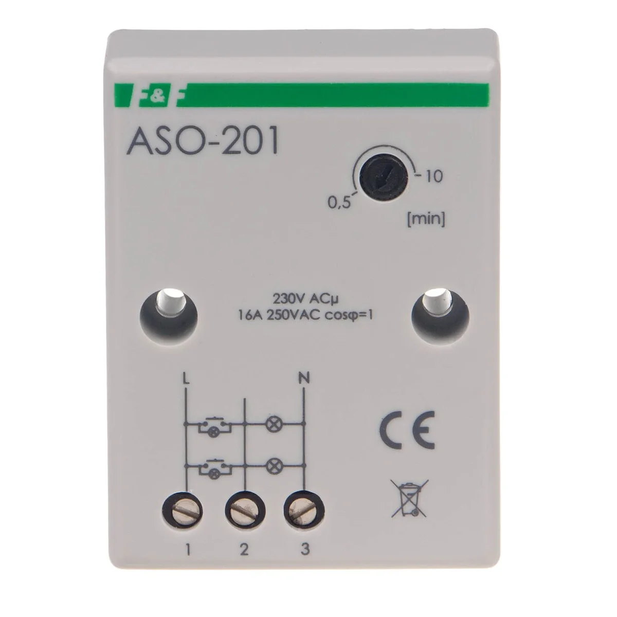 Der über einen Klingelschalter aktivierte Treppenlichttimer hält die Beleuchtung für die eingestellte Zeit aufrecht. (von 0,5 Minuten bis 10 Minuten). Nach Ablauf der eingestellten Zeit schaltet die Automatik die Beleuchtung automatisch aus. Nachdem wir die Beleuchtung ausgeschaltet haben, können wir sie wieder einschalten.