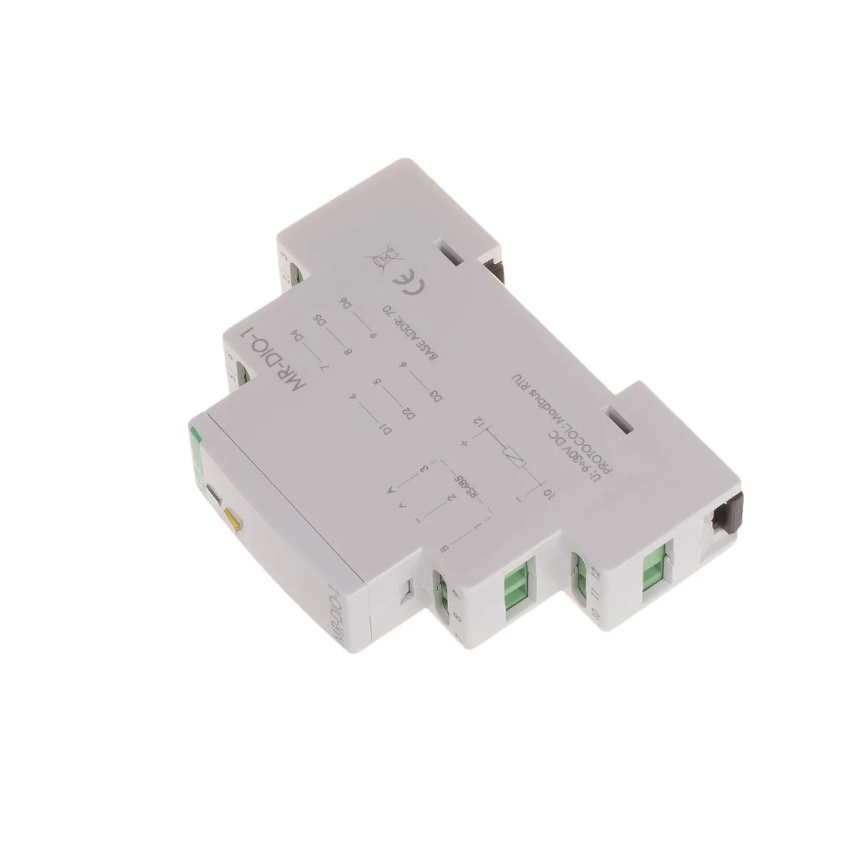 Das MR-DIO-1-Modul verfügt über 6 Universalkontakte. Jeder der Kontakte kann je nach Anschlussart ein digitaler Ein- oder Ausgang sein. Der als „potentialfreier Kontakt“ behandelte digitale Eingang wird durch Schließen des Stromkreises dieses Eingangs zum „Minus“ der Modulversorgungsspannung realisiert. Der als „Open Collector“ behandelte digitale Ausgang wird realisiert, indem der Stromkreis dieses Ausgangs mit dem „Plus“ der Versorgungsspannung des Moduls geschlossen wird. Das Modul hat die Funktion, den Zustand der Ausgänge im nichtflüchtigen lokalen Speicher zu speichern. Bei jedem Einschalten des Moduls werden die Ausgänge auf den gespeicherten Zustand zurückgesetzt. Das Lesen des Status von Kontakten oder das Setzen ihres Status erfolgt über den RS485-Port unter Verwendung des MODBUS RTU-Kommunikationsprotokolls. Alle Kommunikations- und Datenaustauschparameter sind werkseitig voreingestellt. Eine Ausnahme bildet die Netzwerkadresse des Moduls, die mit einem Mehrpositionsschalter unter der Frontplatte des Moduls eingestellt wird. Das Einschalten der Versorgungsspannung wird durch die grüne U-LED angezeigt. Der korrekte Datenaustausch zwischen dem Modul und dem anderen Gerät wird durch die gelbe Tx-LED angezeigt.