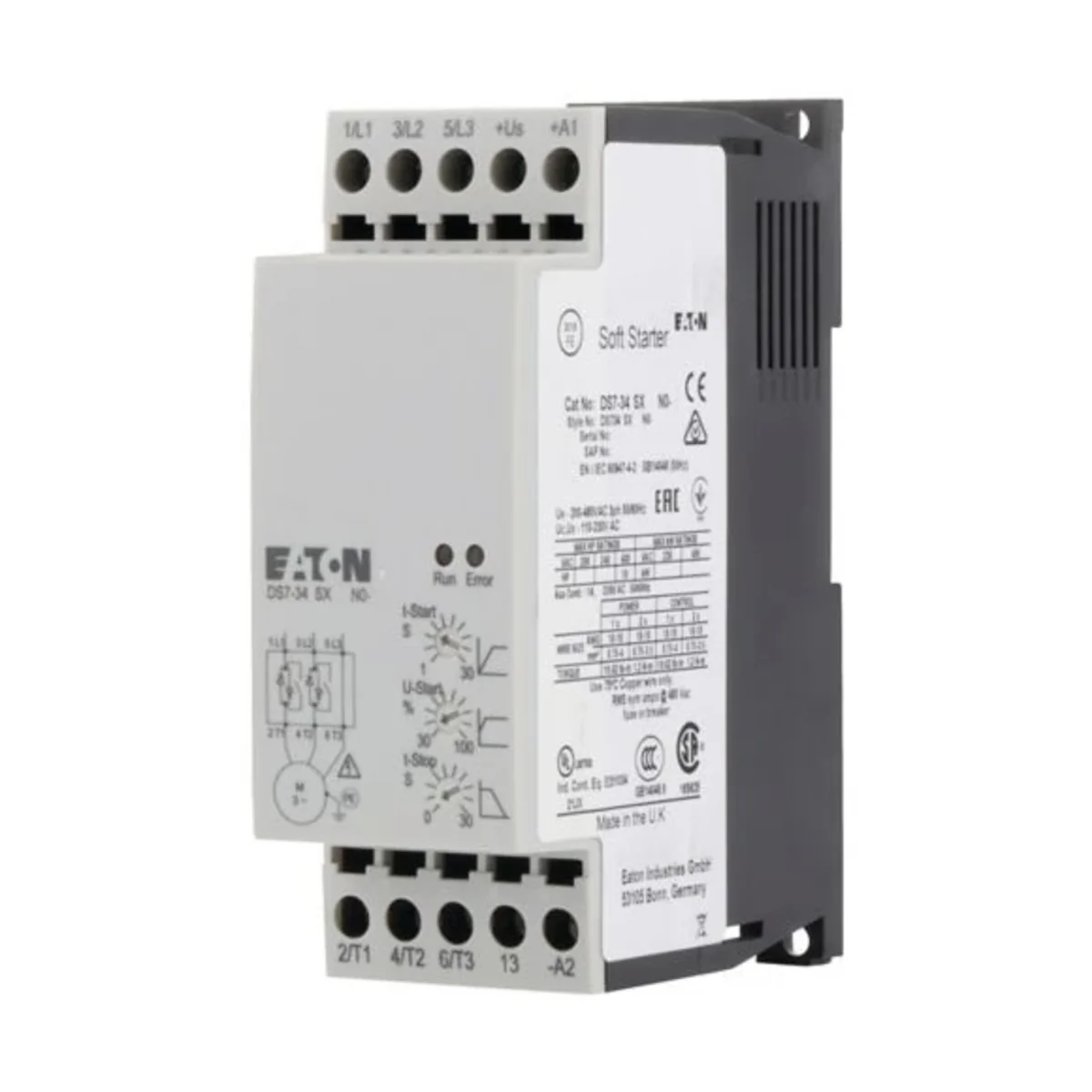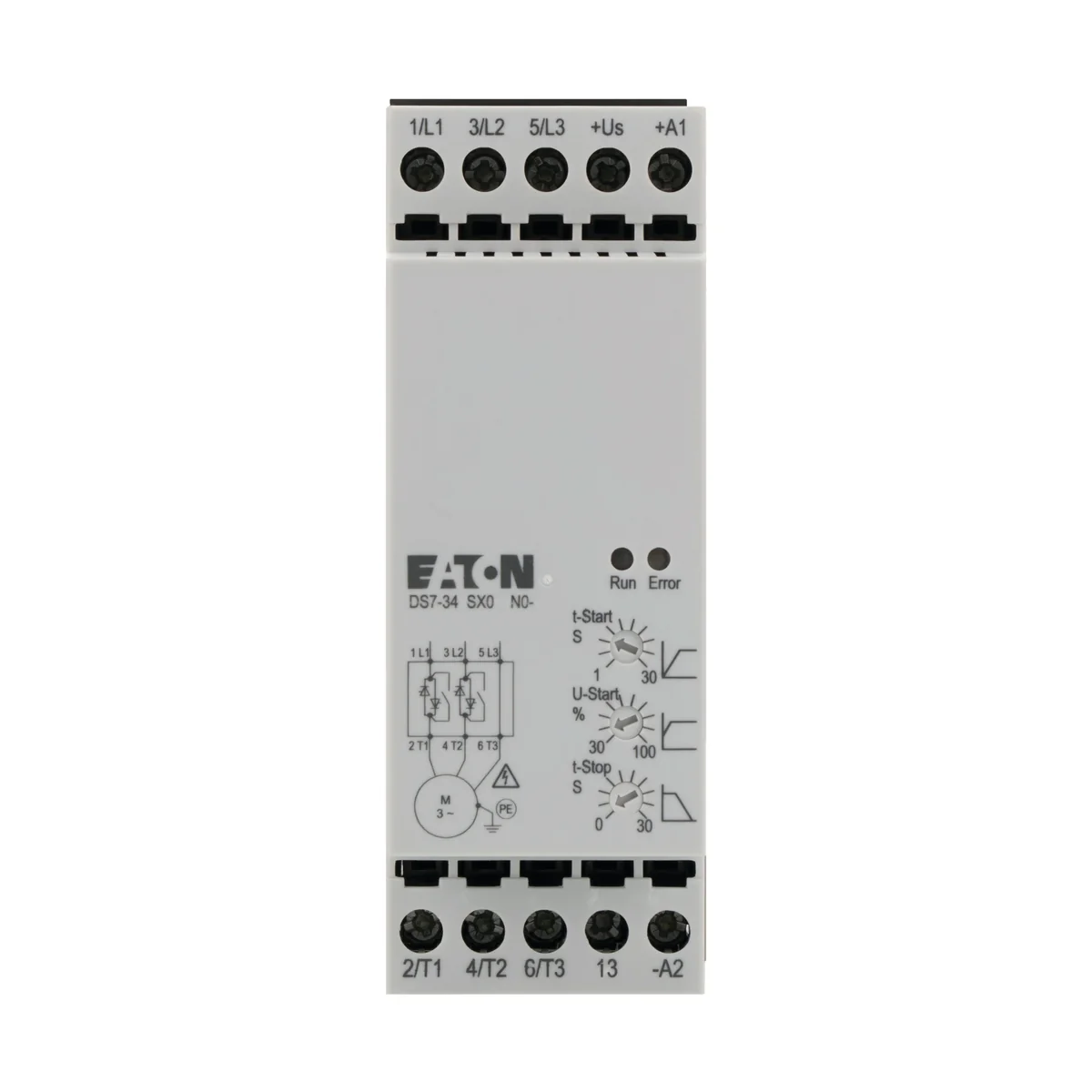 DS7 Softstarter. Sanftstarter für dreiphasige Verbraucher, Netzspannung 230-480 V AC (50/60 Hz). Bemessungsspannung des Steuerstromkreises Uc: 24 V AC/DC.