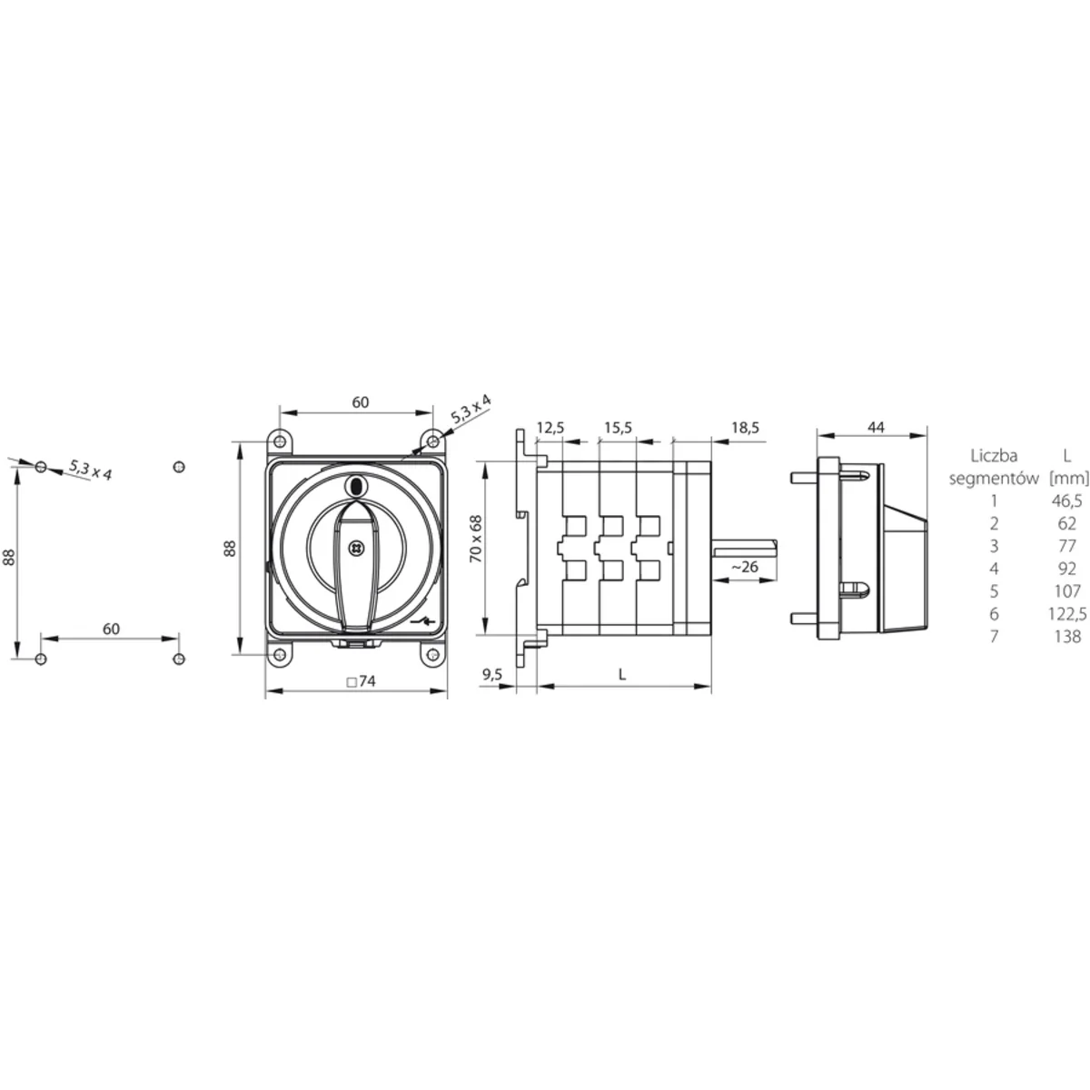 Nockenschalter 63A, 0-1 vierpoliger Lasttrennschalter, Tragschienenbefestigung, gelb-rot abschließbare Front