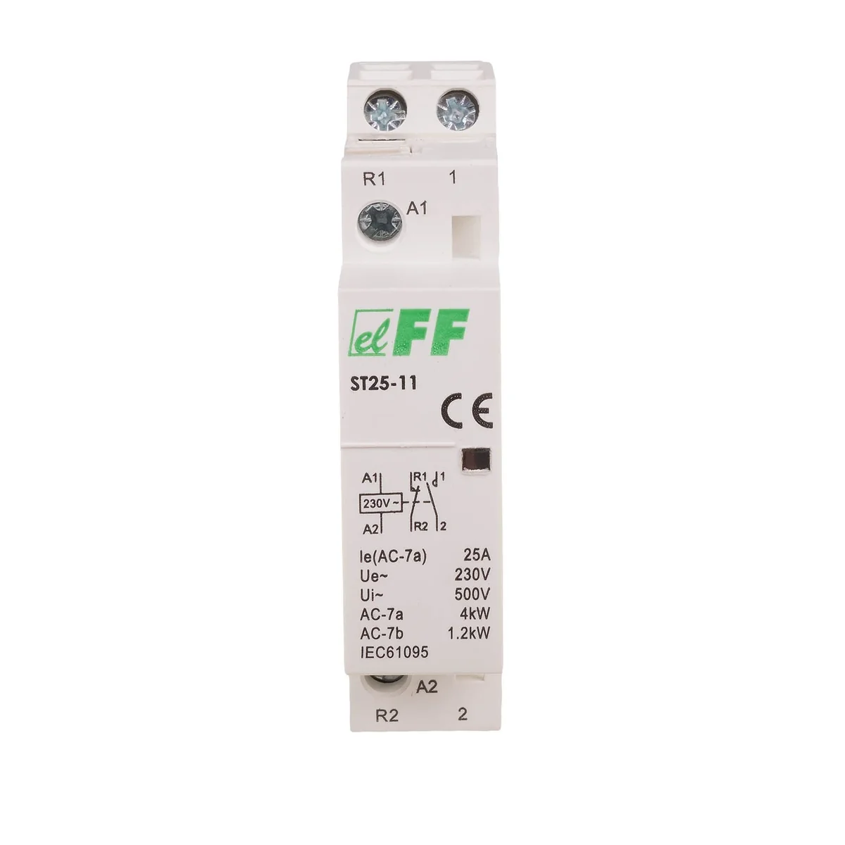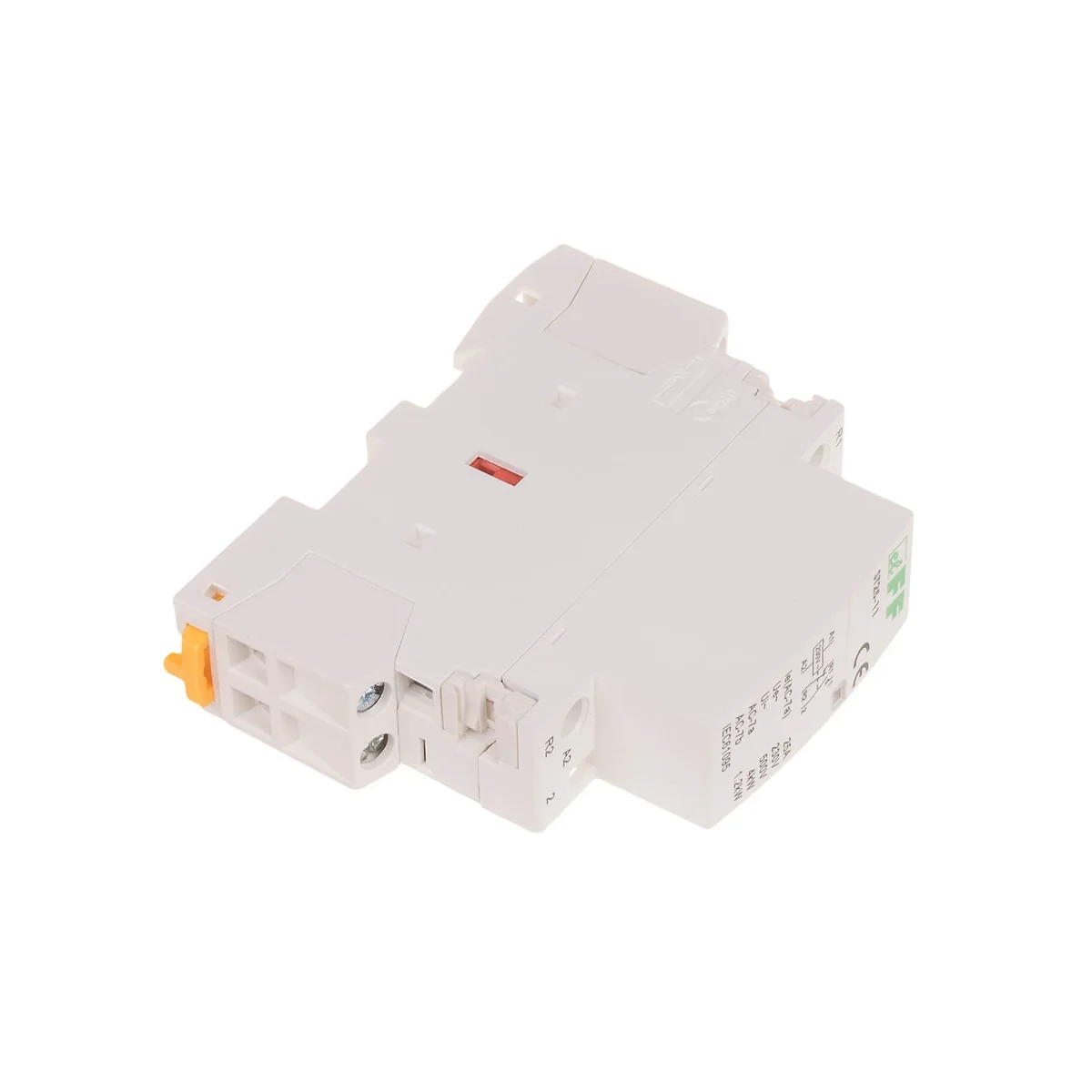 Elektromagnetische Schütze im Modulgehäuse zur direkten Montage auf einer 35-mm-Schiene. Durch Anlegen der Versorgungsspannung an die Schützspule wird der Kontakt geschaltet. Der Aktivierungsstatus des Schützes wird durch eine rote Markierung im Fenster angezeigt. Nach einem Stromausfall kehren die Kontakte in ihre ursprüngliche Position zurück.
