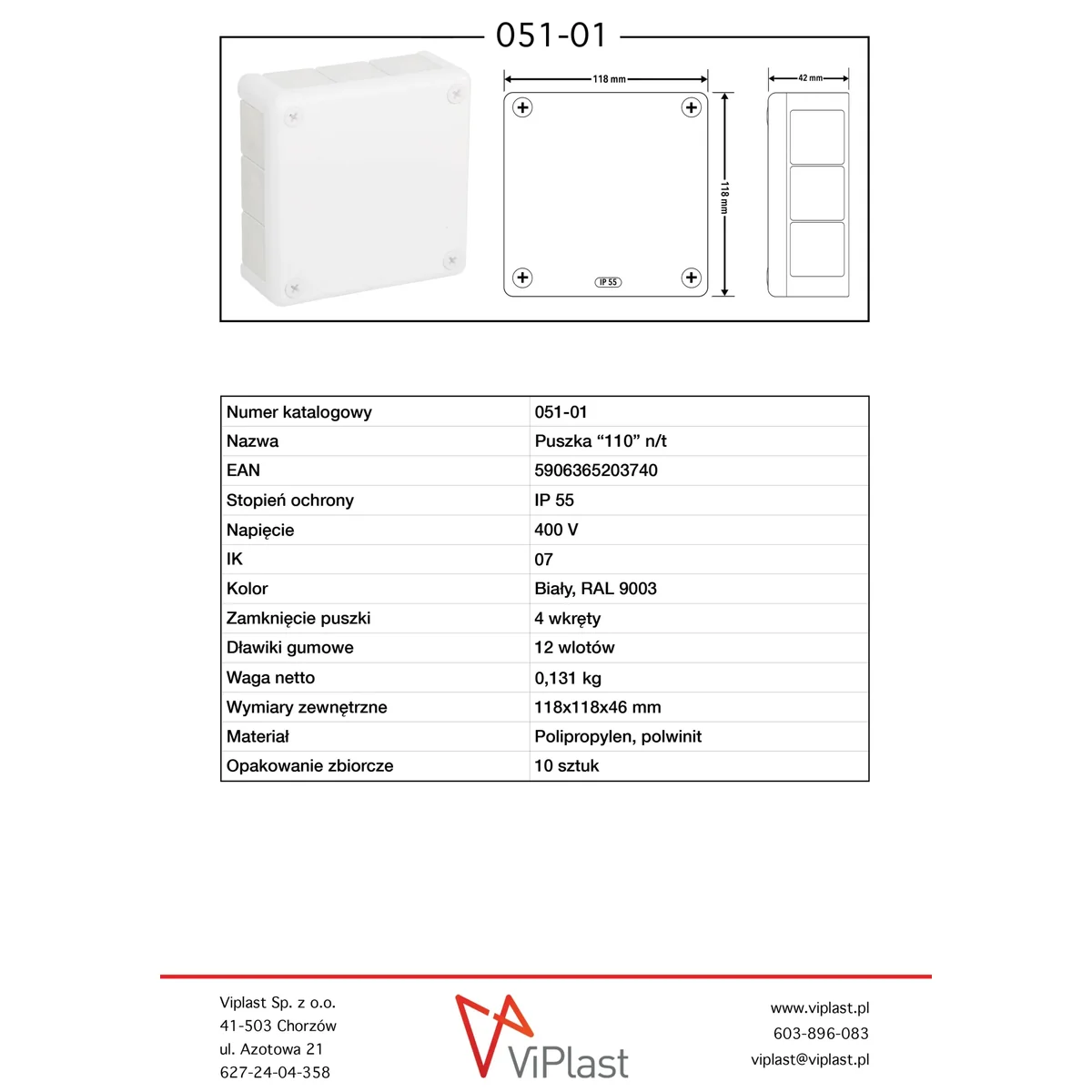 Aufputzdose „110“, Größe 118 x 118 x 46 mm, Schutzart IP55, 12 Eingänge mit Gummiverschraubungen (ohne Gewinde). Es ist mit einem Deckel mit 4 Schrauben ausgestattet. In Weiß.