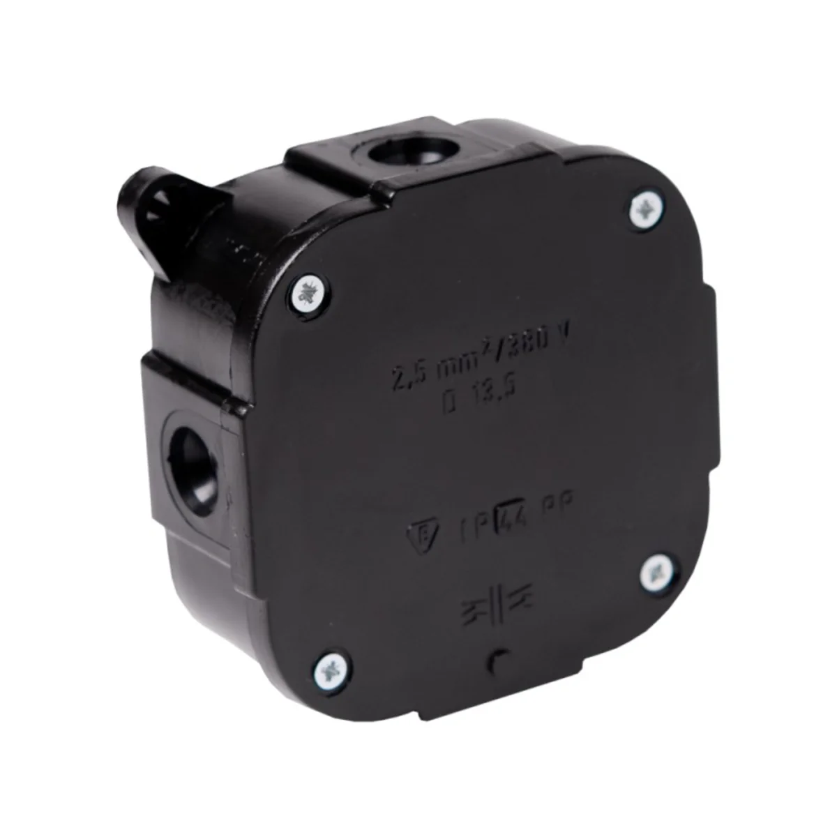 Aufputzdose, Größe 88 x 88 x 40 mm, mit IP44-Schutz, 4 Eingänge mit Ausbrechöffnungen; Es können Gewindeverschraubungen verwendet werden. Es ist mit einem Deckel mit 4 Schrauben ausgestattet. In Schwarz.