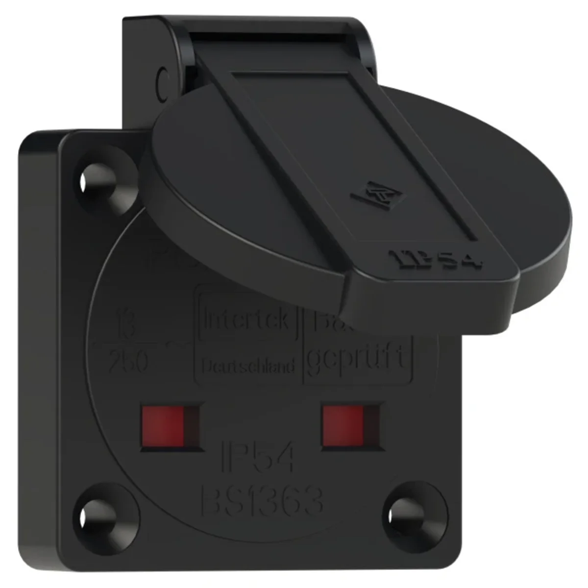 Platinensteckdose Englische Version 13A 2P+E 230V 50/60Hz IP54, seitlicher Anschlussflansch 50X50, vernickelte Kontakte 1020-5S
