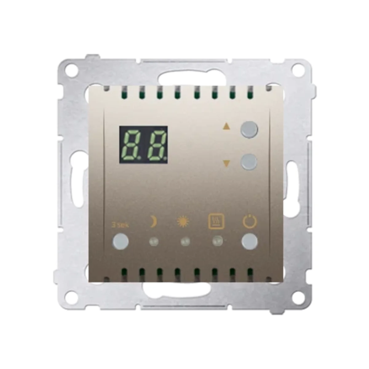 Temperaturregler mit Display und internem Temperatursensor aus der Serie SIMON 54 in Mattgold, metallisiert. Es war aus Kunststoff. Die Nennspannung beträgt 230V. Befestigung mit Krallen oder Schrauben. Mit Schraubklemmen.