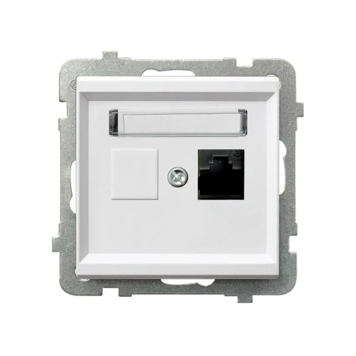 Einzelne RJ-45-Computerbuchse, Kategorie 5e MMC. Es dient zum Anschluss eines Twisted-Pair-Signalkabels, ungeschirmt, Kategorie 5e. Die Datenübertragungsrate beträgt 1 Gbit/s.