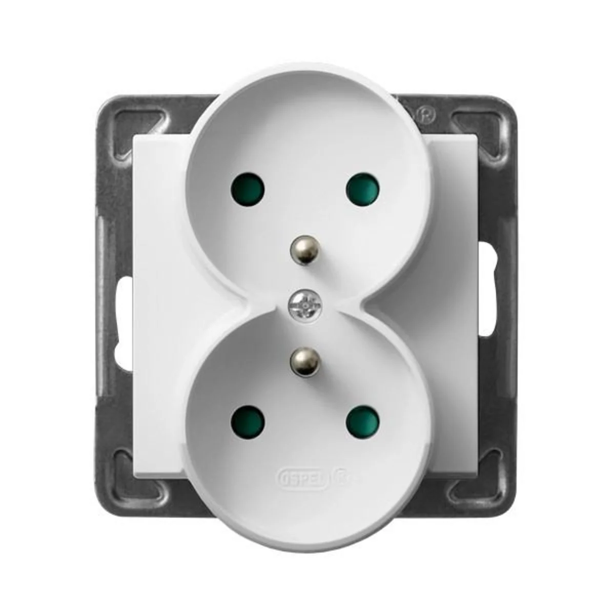 Steckdose doppelt, mit Erdung, zur Ausstattung mit Rahmen, mit Blenden für Strompfade.
