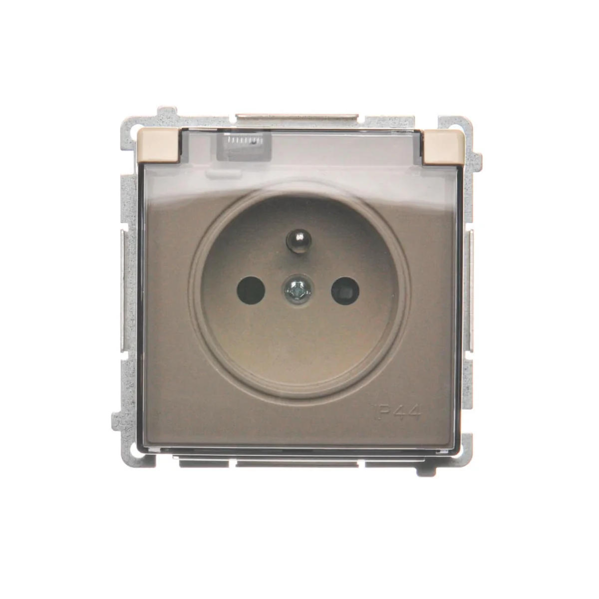 Einzelsteckdose mit Erdung, IP44-Ausführung, mit Blenden für Strompfade.