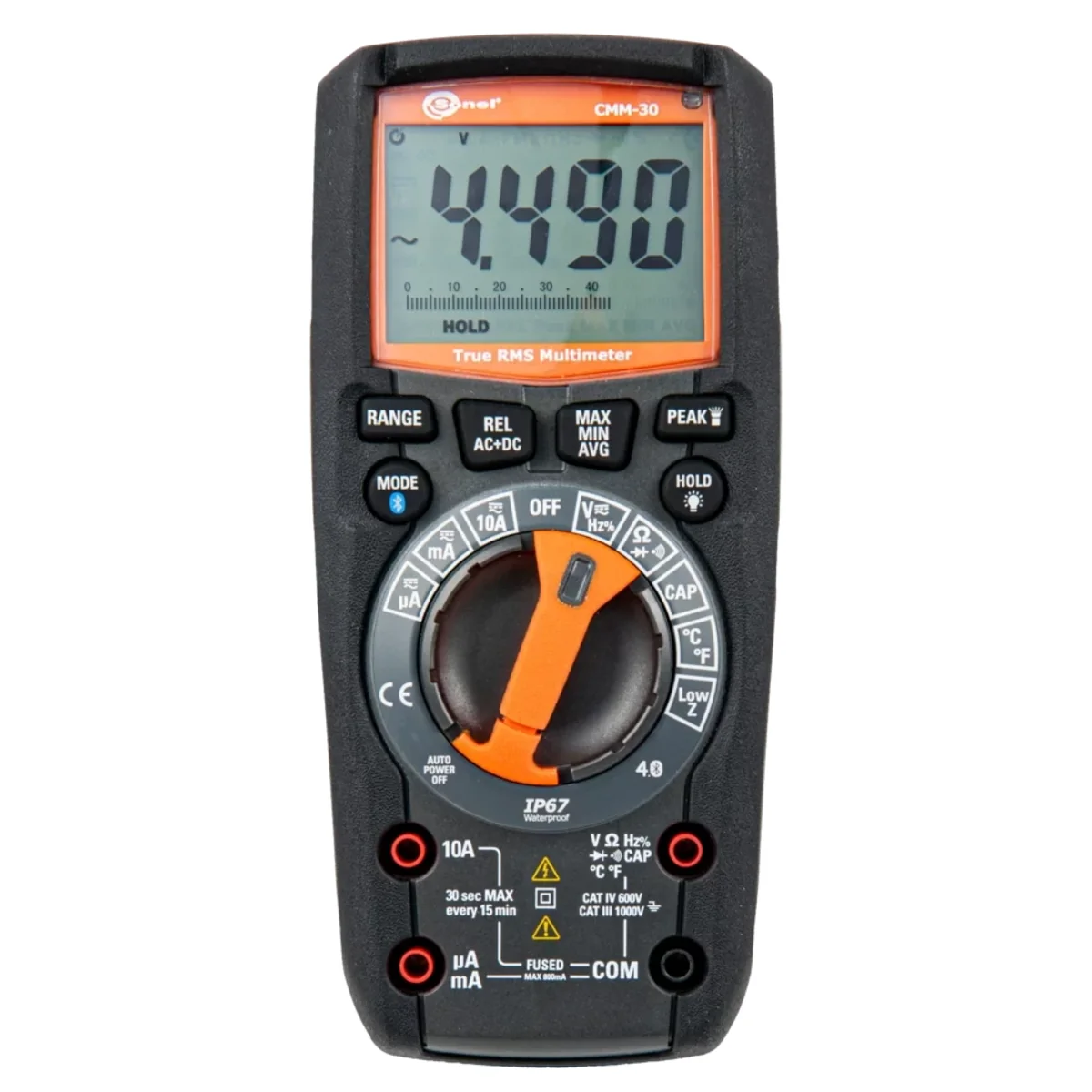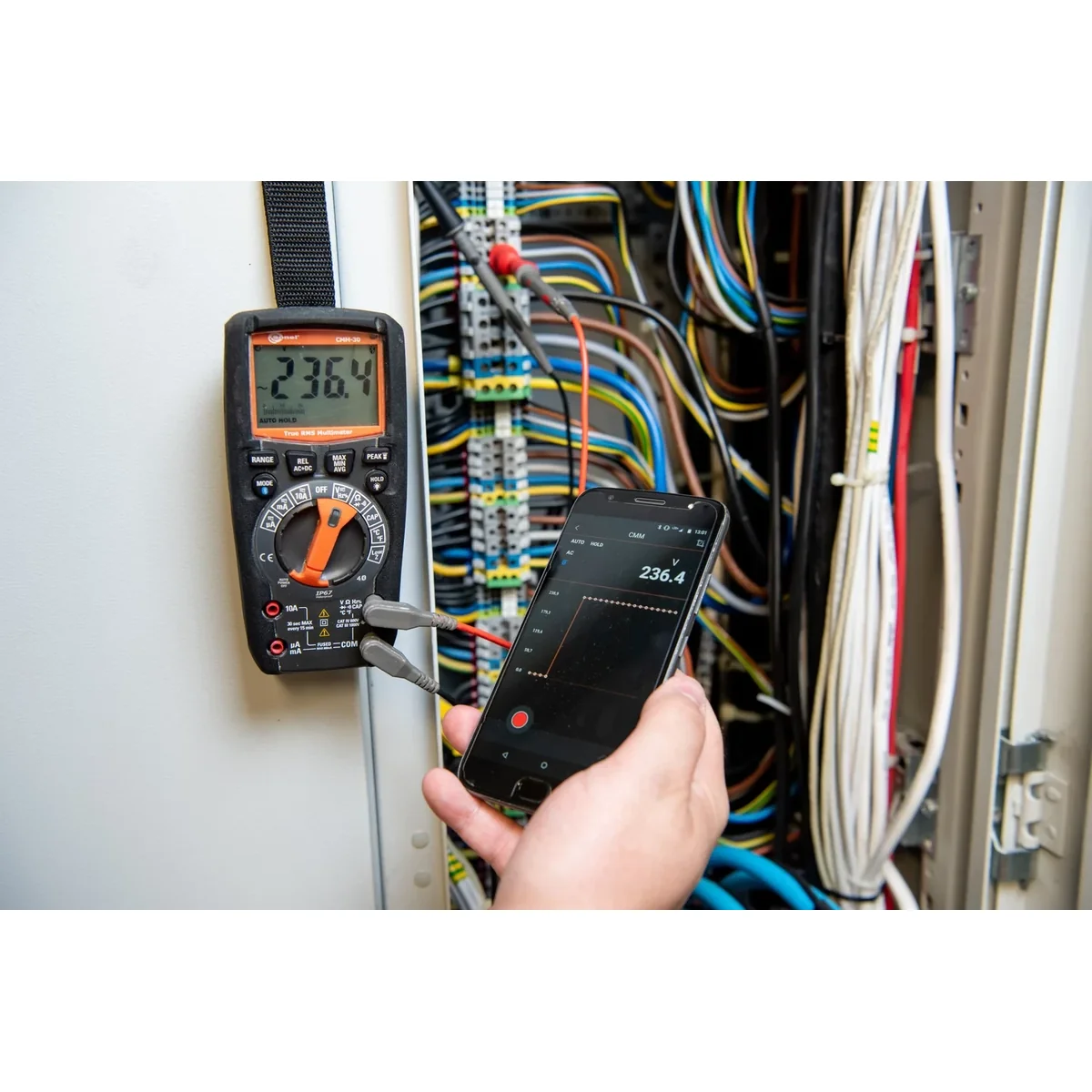 Das kompakte und zuverlässige Industriemultimeter Sonel CMM-30 ist ein Gerät, das Vielseitigkeit, Modernität und eine außergewöhnliche Haltbarkeit kombiniert. Das Gerät verfügt über 11 grundlegende Messfunktionen. Die Möglichkeiten des Gerätes werden um zusätzliche Funktionen abgerundet, wie PEAK (Anzeigen des Spitzenwertes des gemessenen Signals), REL (Durchführung von relativen Messungen) und viele andere. All dies verleiht dem Messgerät einen vielseitigen Charakter. Dank der kabellosen Kommunikation mit der App im Telefon, ist es möglich, die Messungen an schwer zugänglichen Stellen vorzunehmen und aufzuzeichnen. Das Display verfügt über die Funktion des automatischen Beleuchtung: Die Helligkeit des Bildschirms und des Bedienfeldes passt sich an die Lichtverhältnisse an. Einen zusätzlichen Vorteil stellt die eingebaute Taschenlampe dar, mit der auch in der Dunkelheit gearbeitet werden kann.