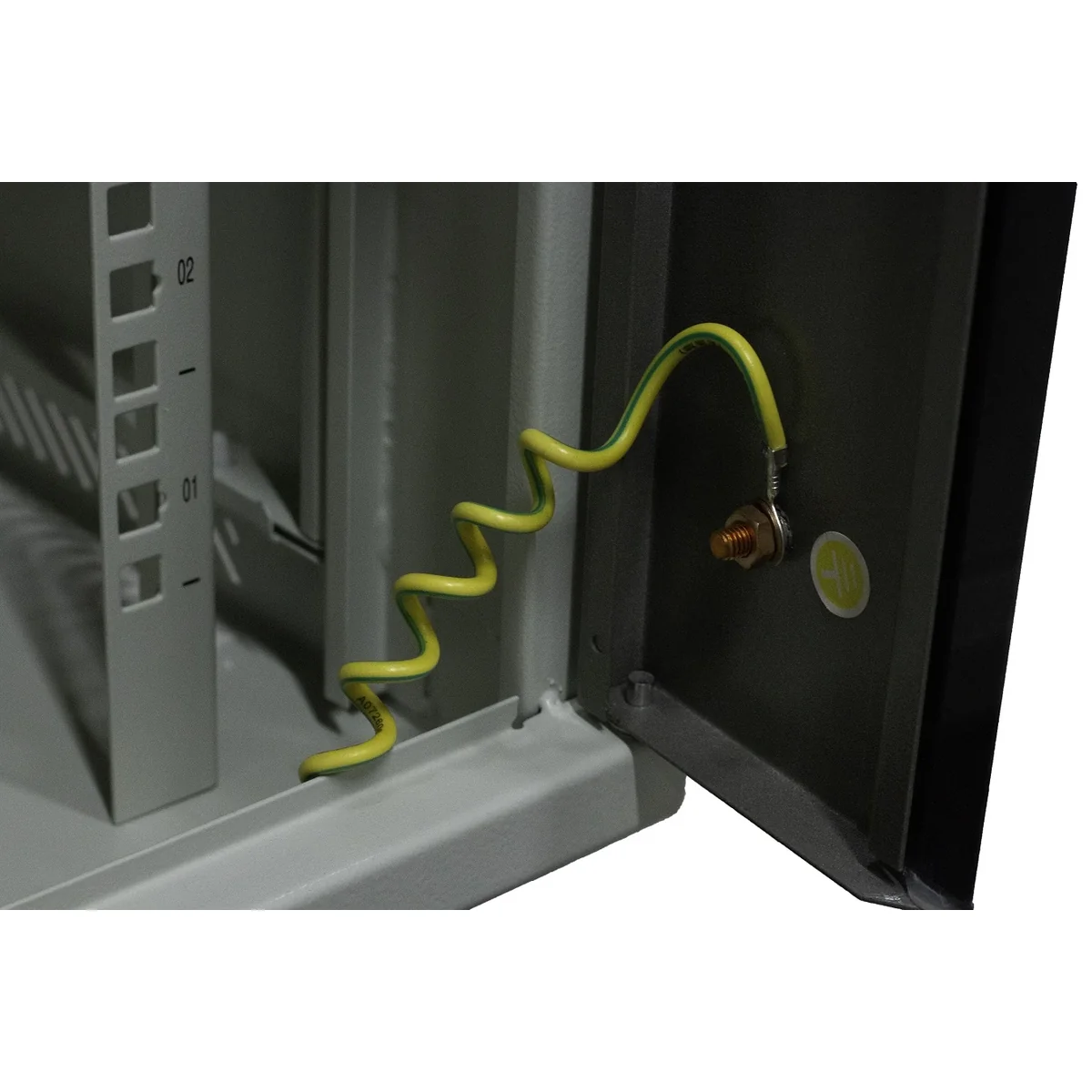 Die Konstruktion des Schranks besteht aus Stahlblech. Das Gehäuse verfügt über zwei Kabelauslässe (340x60mm, 1xOberteil, 1xUnterteil). Vordertür mit eingeklebtem Hartglas und 1-Punkt-Verriegelung, montiert auf Scharnieren, die ein Öffnen der Tür um 180 Grad ermöglichen. Abnehmbare Seitenabdeckungen mit Reißverschluss. Zwei Ebenen 19“ vertikale Montageprofile, montiert auf horizontalen Traversen im Raster alle 20 mm, Mindestabstand zur Haustür 35 mm (Standard 65 mm). Im Dach des Schrankes sind Öffnungen für den Einbau von 1-Lüfter-Lüftungsmodulen vorgesehen. 300 mm langes Kabel zur Erdung. Festes Regal 270 mm und 15 Befestigungsschrauben in der Standardausrüstung. Die Schränke sind für den Innenbereich bestimmt.