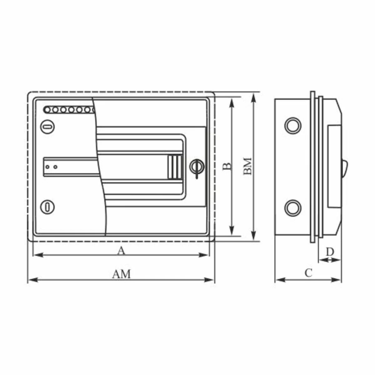 • Schalttafeln, ausgestattet mit einer transparenten, getönten Tür, die sich seitlich (nach links oder rechts) öffnen lässt und mit einem Schlüsselschloss ausgestattet werden kann,