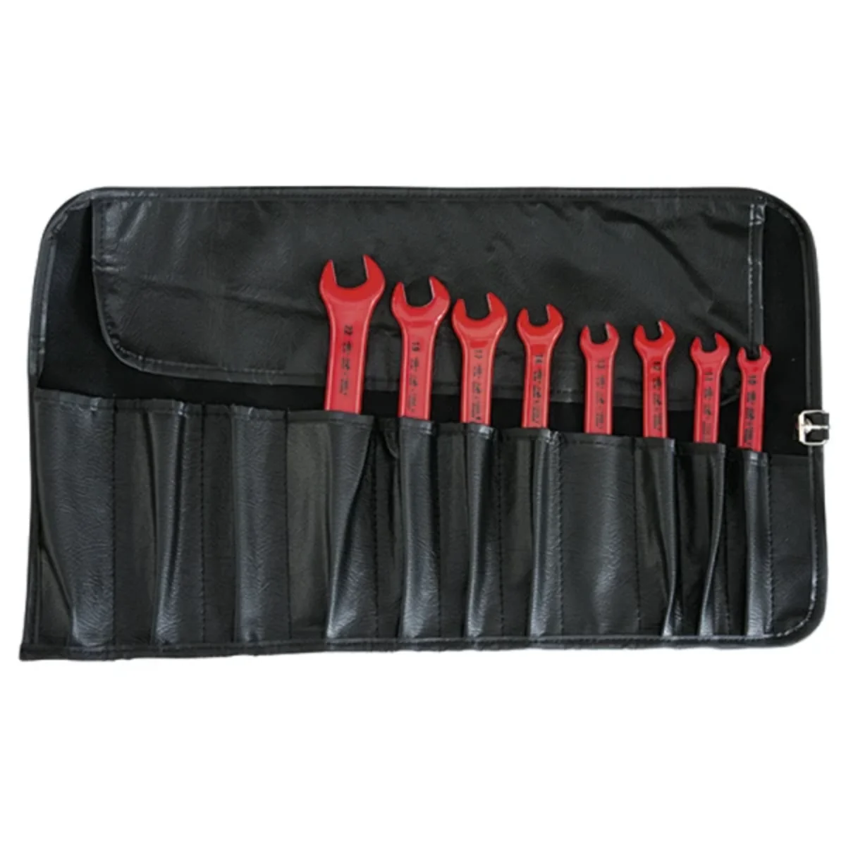 Satz mit 1000-V-Gabelschlüsseln in einer schwarzen Kunstleder-Rolltasche, Inhalt: 8 Gabelschlüssel aus Chrom-Vanadium-Stahl, Backenposition 15°, zweifarbige Tauchisolierung – außen rot/innen gelb, Art.-Nr. 22 00 02