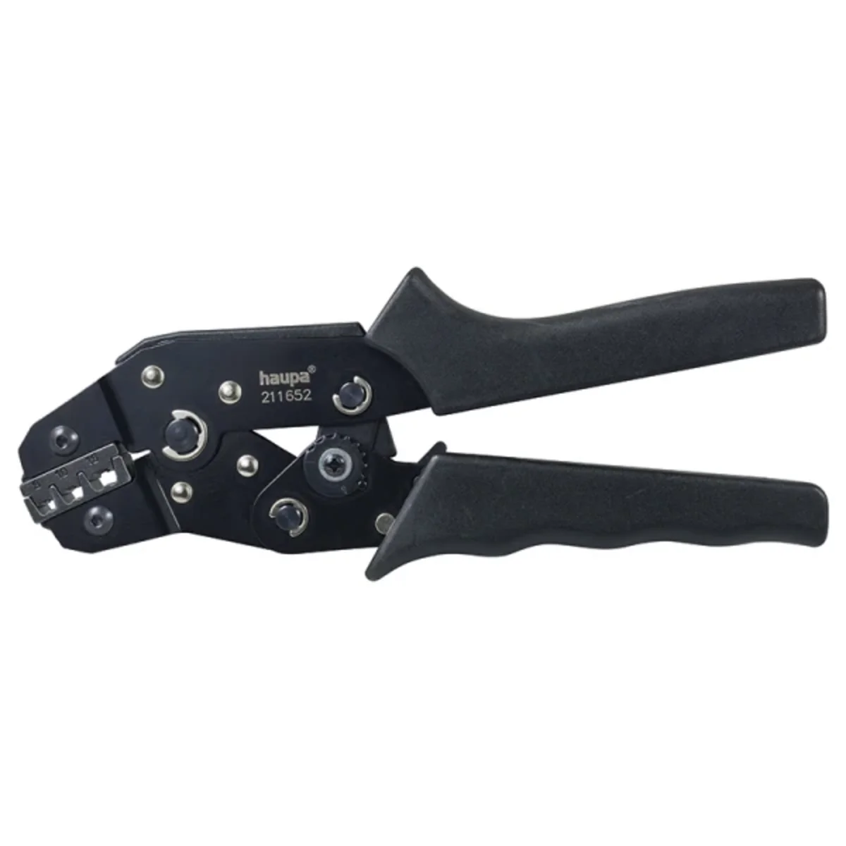 Crimpzange in leichter Ausführung, handliche Form mit 20 % Kopfkrümmung, mit Entriegelungssperre