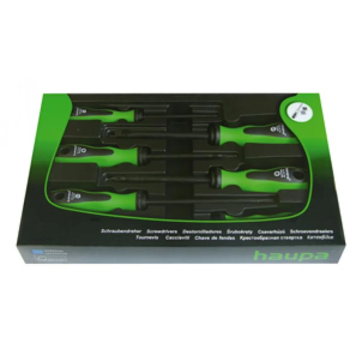 Werkzeugset: 6-teiliges Schraubendreher-Set mit 2-Komponenten-PP/TPE-Griff. Im Set enthalten: 2 Elektriker-Schraubendreher, 2 Werkstatt-Schraubendreher, 2 Kreuzschlitzschraubendreher