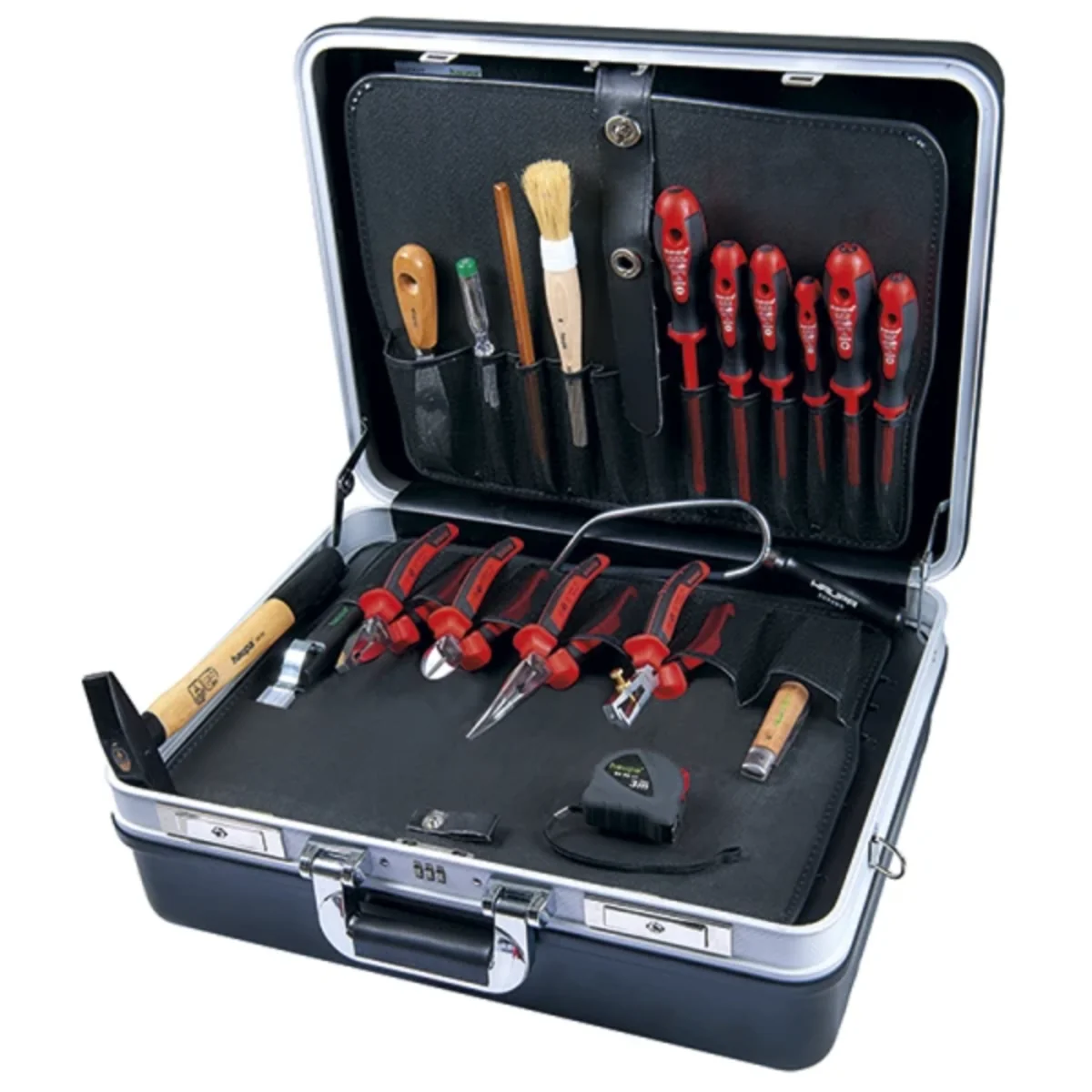 Hartplastikkoffer, schwarz, zwei Werkzeugablagen, digitales Codeschloss, mit einer Tasche für Dokumente, der Kofferboden ist mit verschiedenen Fächern frei unterteilbar, bestückt mit 19 verschiedenen Werkzeugen. Inhalt: • 2K-VDE-Elektriker-Schraubendreher, 2,5 x 75, 4 x 100, 5,5 x 125, 6,5 x 150 mm • 2K-VDE-Kreuzschlitzschraubendreher, PH, Größe 1 und 2 • 2K-VDE-Kombinationszange, 185 mm • 2K-VDE-Telefonzange, 200 mm • 2K-VDE-Isolierzange, 160 mm • 2K-VDE-Seitenschneider, 165 mm • Abisolierzange mit Hakenklinge ? 8-28 mm • Monteurmesser, 1-teilig • 300 gr. Schlosserhammer • PUK-Bügelsäge • Elektromeißel 10 x 250 mm • Spannungsanzeige, Klingenlänge 50 mm • 2 m Maßband • 40 mm Spachtel • Pinsel