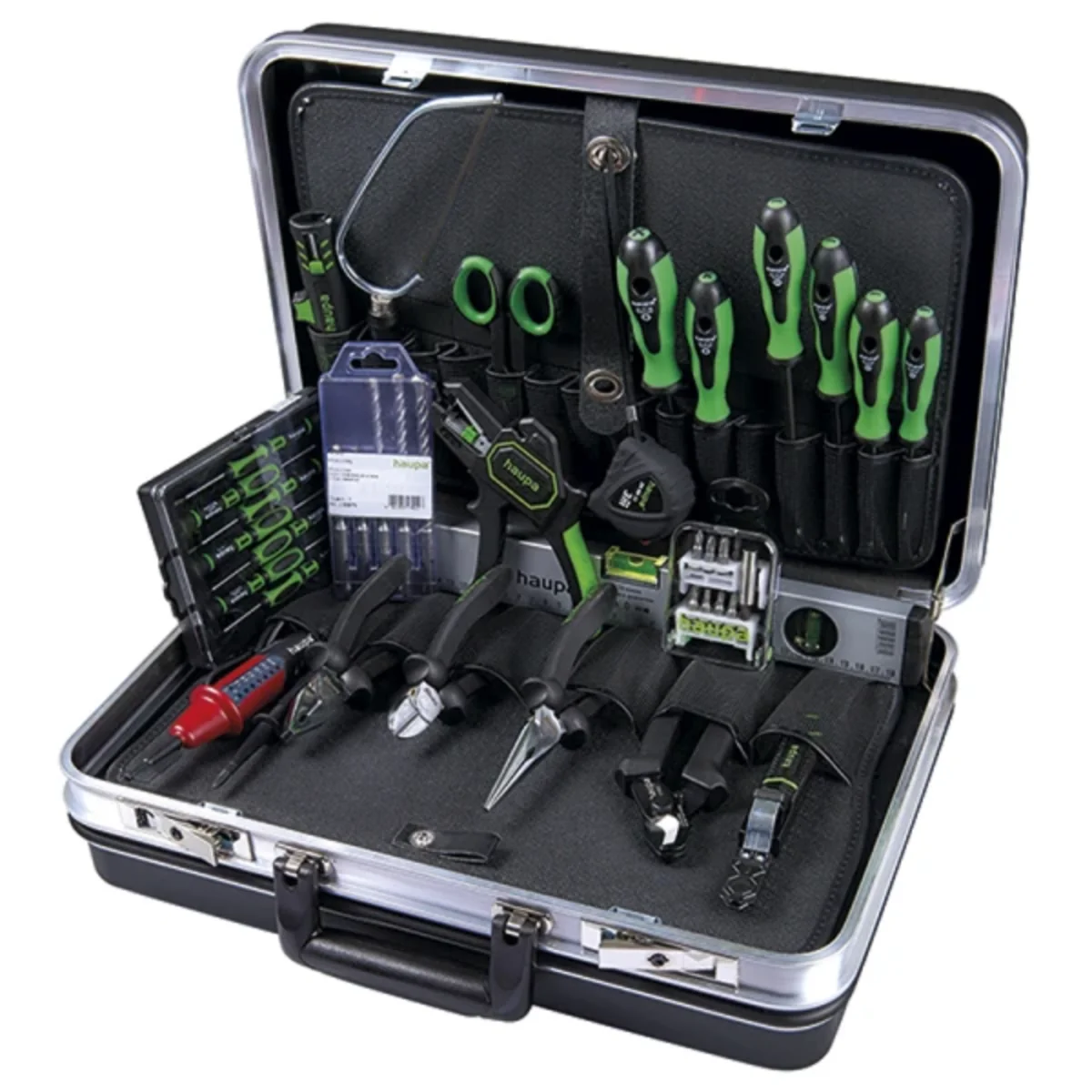 Inhalt: • 2K-Elektriker-Schraubendreher, 2,5 x 75, 4 x 100, 4 x 125 und 5 x 150 mm • 2K PH-Kreuzschlitzschraubendreher, Größe 1 und 2 • Elektronik-Schraubendreher-Set, 7-teilig • 2K Zange, 180 mm • 2K-Seitenschneider, 160 mm • 2K-Telefonzange, 200 mm • Abisolierzange mit Hakenklinge ? 8-28 mm • Abisolierzange 4 - 16 mm • Automatischer Abisolierer 0,2 – 6 mm • Kabelschneider • 2K-Softgriff-Universalschere • PUK • HAUPA-Taschensäge „Bit-Box“, 17-tlg. • SDS plus 5- teiliger Bohrersatz • 400 mm leichte Metallwasserwaage • 3 m Maßband • „Basic“-Spannungsanzeige