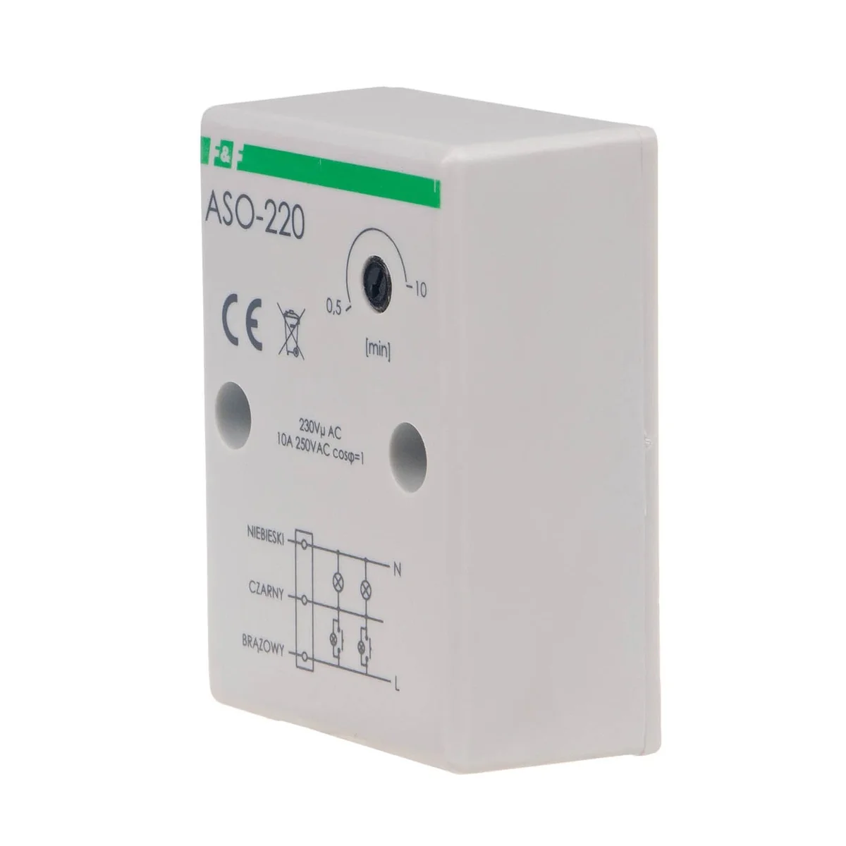 The staircase timer activated with a momentary (bell) switch maintains the lighting for the set time (from 0.5 minutes to 10 minutes). After the set time has elapsed, the automatic device will turn off the lighting automatically. After turning off the lighting, we can turn it on again.