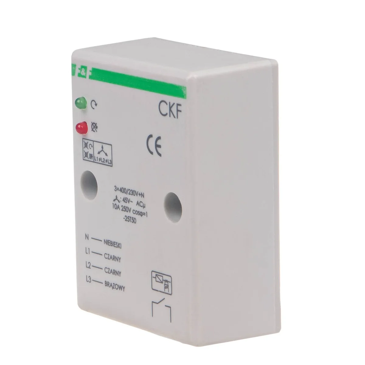 Voltage failure in at least one, any phase or Voltage unbalance [V] between the phases above the activation threshold will cause the motor to be switched off. The switch-off will take place with a delay of 4 seconds, which prevents accidental disconnection of the motor in the event of a momentary voltage drop. Reactivation will occur automatically when voltage increase by 5V above the operating voltage (i.e. the value of the voltage hysteresis). With the above anomalies, starting the engine is impossible. In the event of a change in the sequence of phases before the sensor, causing an undesirable change in the direction of rotation of the motor, the sensor will not allow the motor to start. Reactivation is possible after the return of the correct phase sequence.