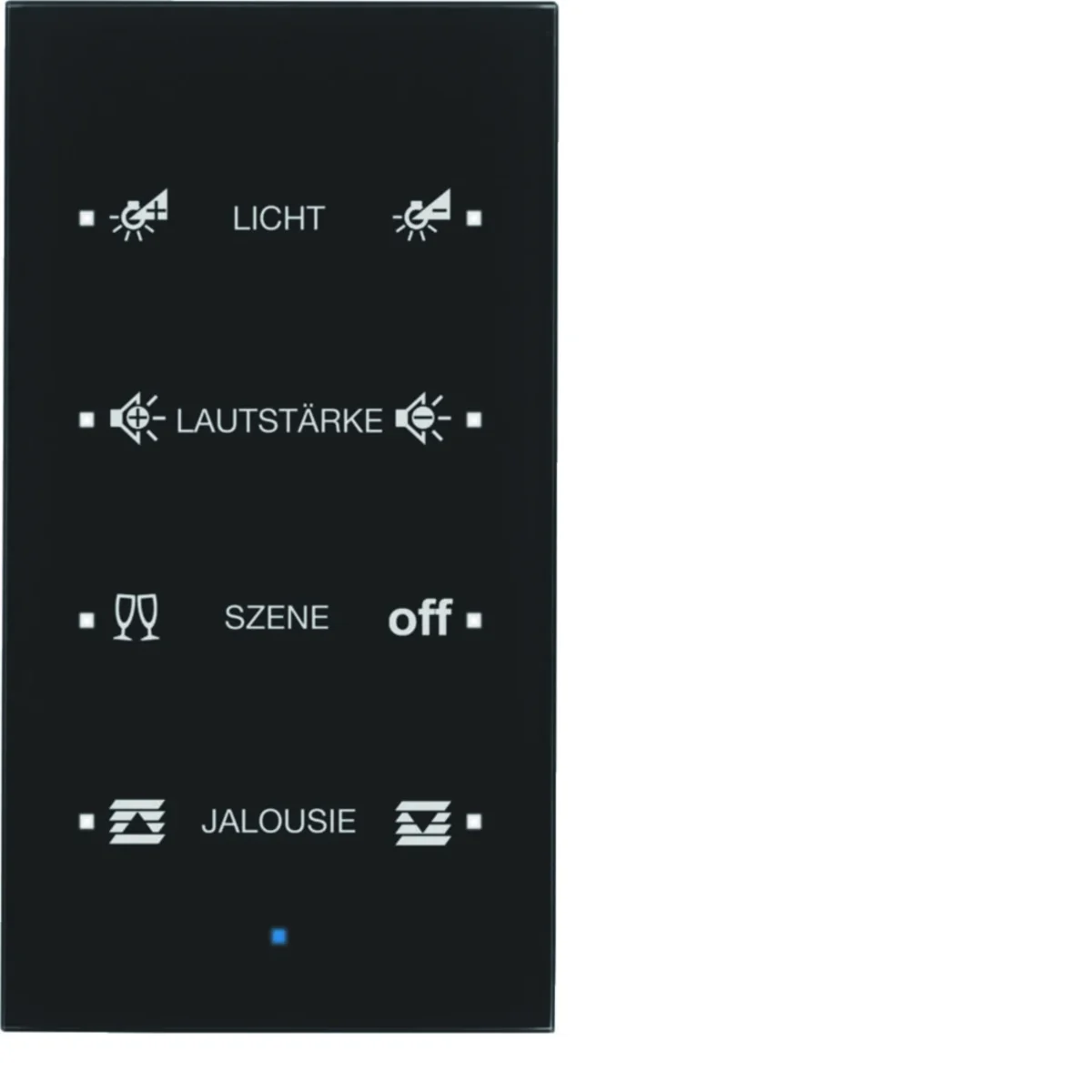 Sensor 4-fold glass touch sensor, Berker TS Sensor series. Main design line: KNX - Berker TS Sensor. Configurable - defined by the user: possible symbols, colors and descriptions are selected using the configurator on the website.
