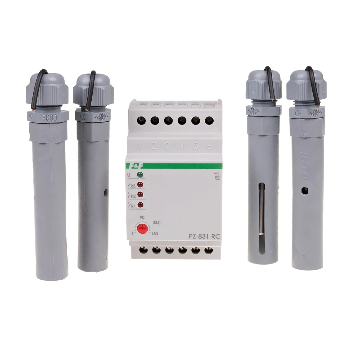 The PZ-831 relay is used to detect the presence of electrically conductive liquids at the levels of installed flood probes. In a dry state (all probes open) all relay contacts are open. Shorting the COM base probe and the next level probe with liquid will close the contact of the relay assigned to the given probe, e.g. when the first level probe R1 is flooded (short circuit of the COM base probe and the R1 level probe) the contact 11-12 will be closed. Similarly for level probes R2 and R3. Lowering the liquid level below the level probe (opening of the COM probe and the level probe) will open the contact assigned to the given probe.