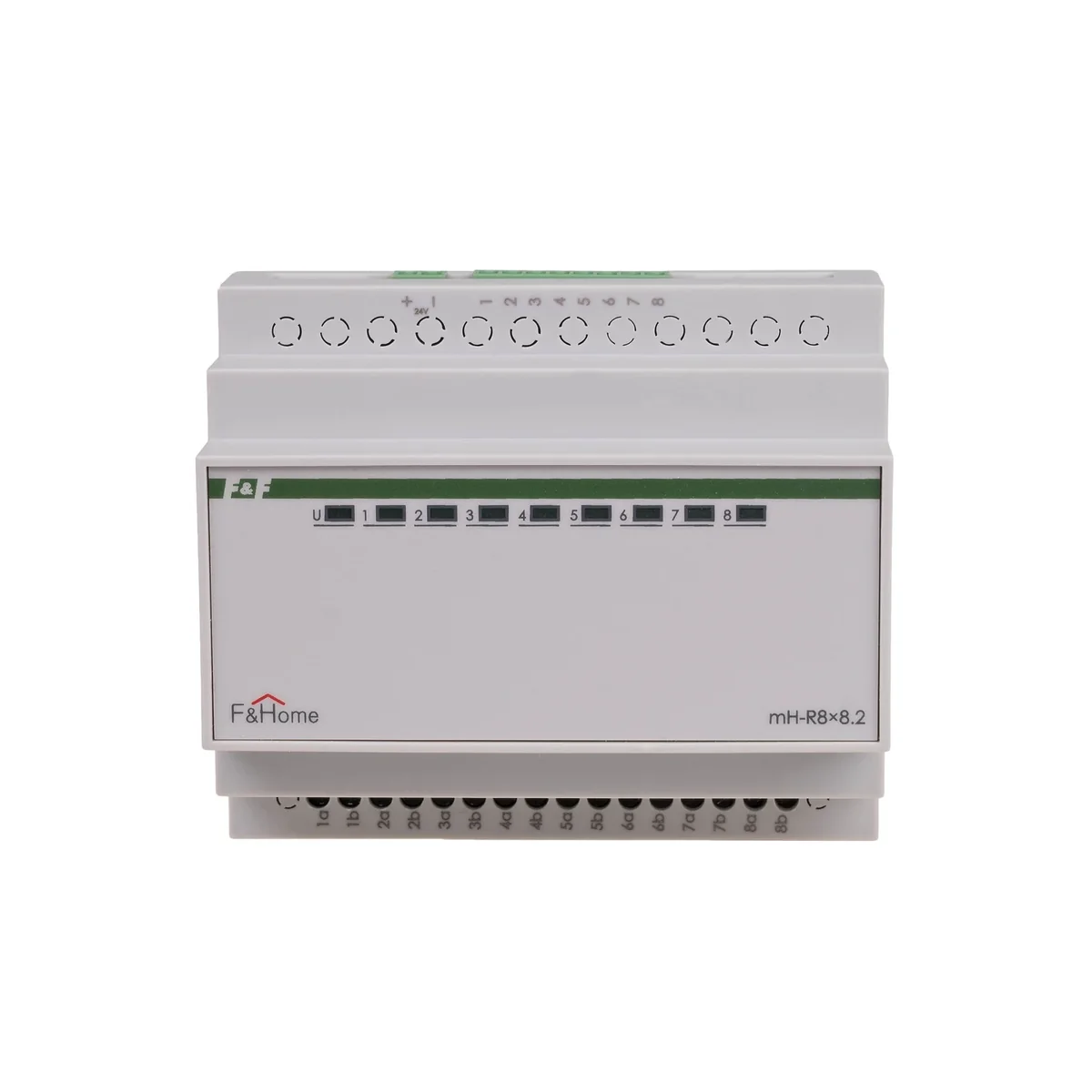 The mH-R8x8 relay module is an executive module designed for direct connection to the mH-IO32, mH-E16 and mH-IO12E6 control modules. The module is equipped with eight independently controlled NO (normally open) outputs with a maximum load capacity of 8A. The module is mounted in the switchgear, occupies a field of 6 modules and is powered with 24VDC. The contact is closed by applying the +24V signal to the corresponding input.