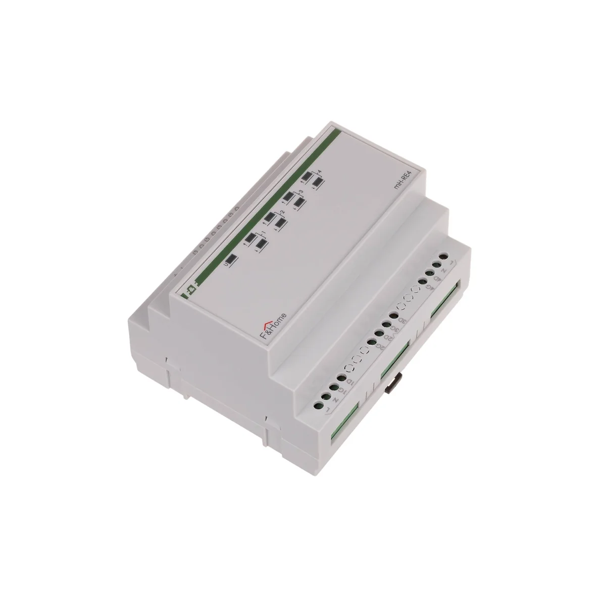 The mH-RE4 relays are dedicated actuators that control the operation of motor devices (in particular roller shutters). The benefits of using dedicated relays are: Protection against simultaneous activation of the up and down direction. Protection against immediate change of direction (time interval). Spark suppression system extending the life of relay contacts and eliminating network disturbances. LEDs on the front of the device showing the current status. The load capacity of the actuators is 8A. Relay modules are mounted in the switchgear and occupy a field of 6 modules.