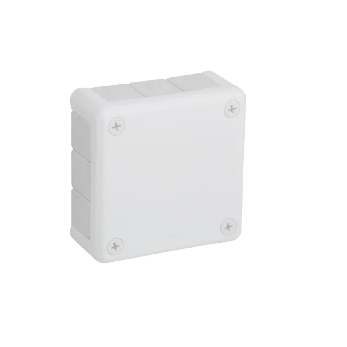 Surface-mounted "90" box, size 98x98x42mm, IP55 protection, 6-inlet with rubber glands (threadless). It is equipped with a lid with 4 screws. In white.