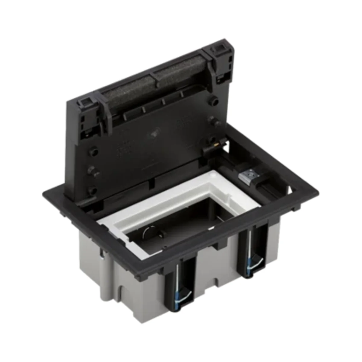 Underfloor installations are the standard for electrical and teletechnical installations in modern workplaces. The use of the SF series floor box enables simple and quick access to media in places away from the walls. The box is made of graphite gray plastic. It is worth noting that it has a IP40 degree of protection. The box installation method is as follows - in a raised floor or in a screed floor. The ability to adjust the depth in the range 70-105mm. The box contains one SIMON 500 module and two K45.