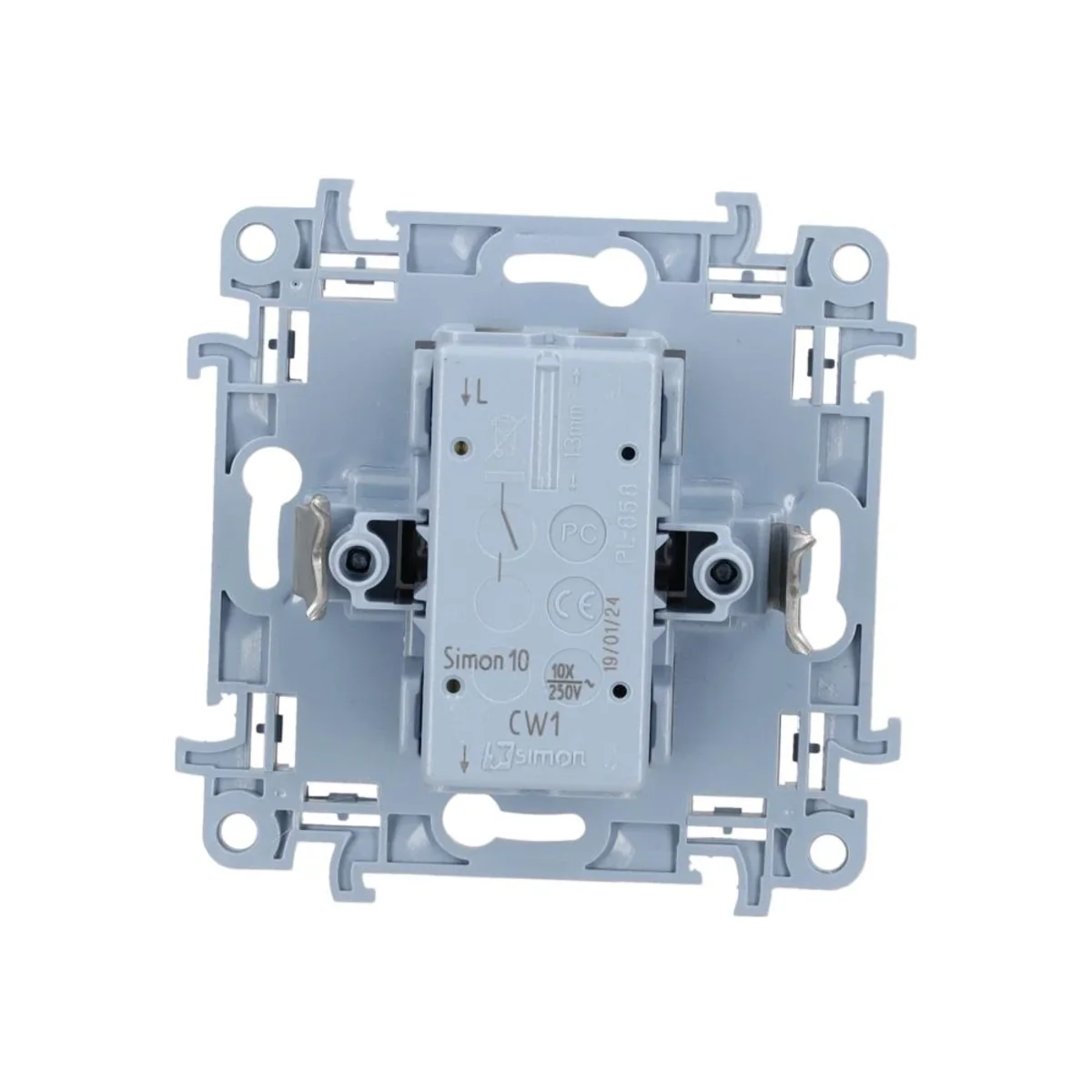 Single-pole switch (bistable) from the Simon 10 series. To obtain IP44 splash-proof class, use a frame gasket.