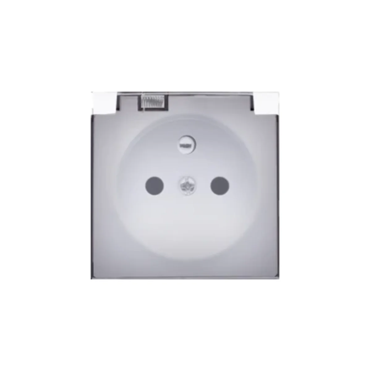 Cover for single socket outlet mechanism with grounding (art. no. 75458-39) from the SIMON 82 DETAIL series. It has an IP44 cover in a transparent color. The lid itself is white.