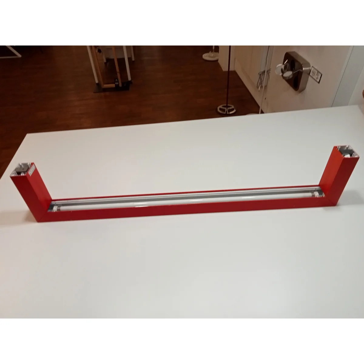 The lamp comes from the exhibition, it has traces of use visible in the photos. Numerous scratches and paint chips are visible.