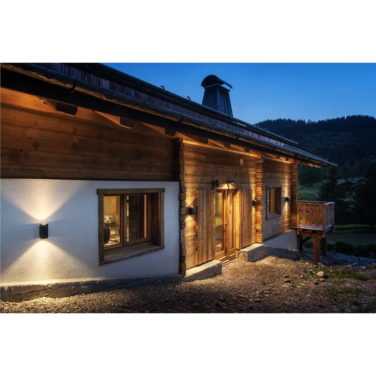 ENOLA is an outdoor wall luminaire in black color, with IP65 tightness class.