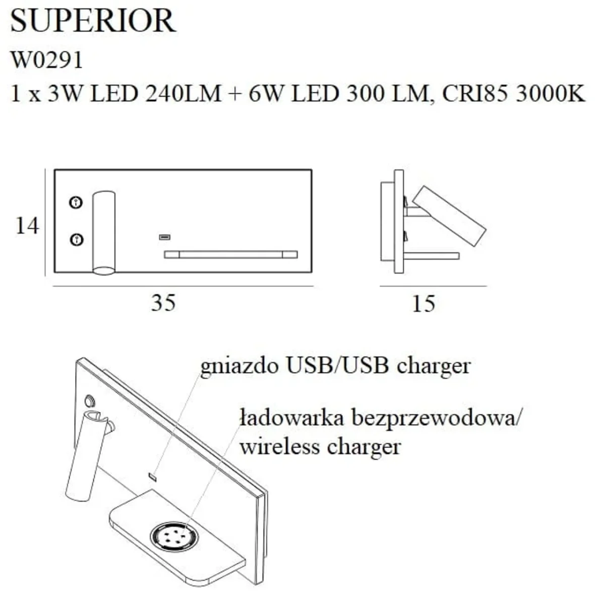 The fixture runs around the perimeter, additionally has a reflector that can be directed, for example, for reading, has a USB charger and an inductive charger in the form of a shelf.
